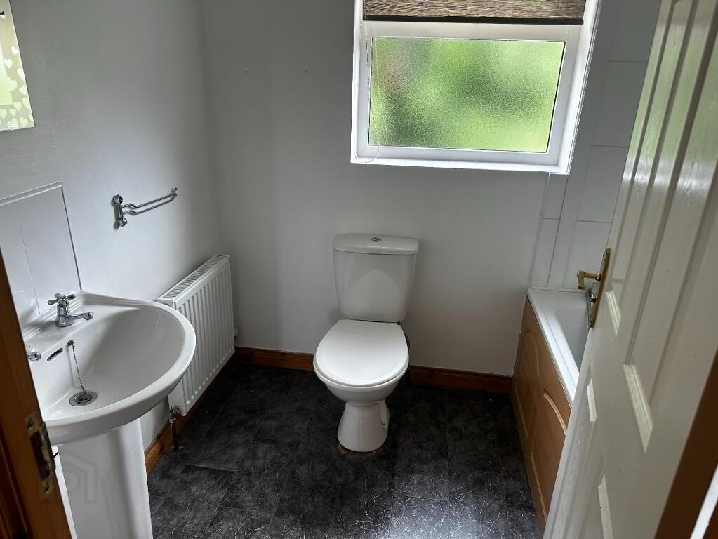 2.12m x 1.7m (6' 11" x 5' 7") Vinyl flooring, electric shower over panel bath, part tiled walls, W/C and pedestal wash hand basin, extractor fan.