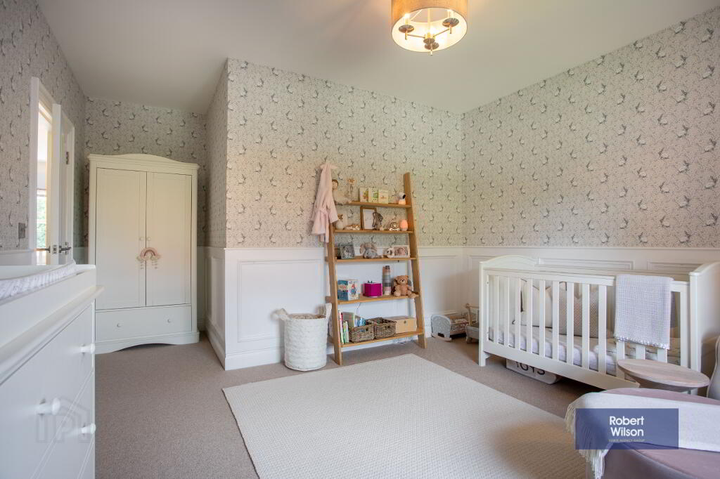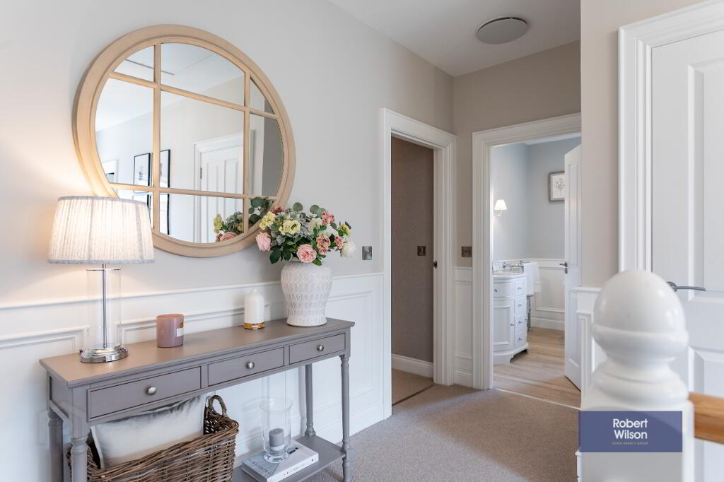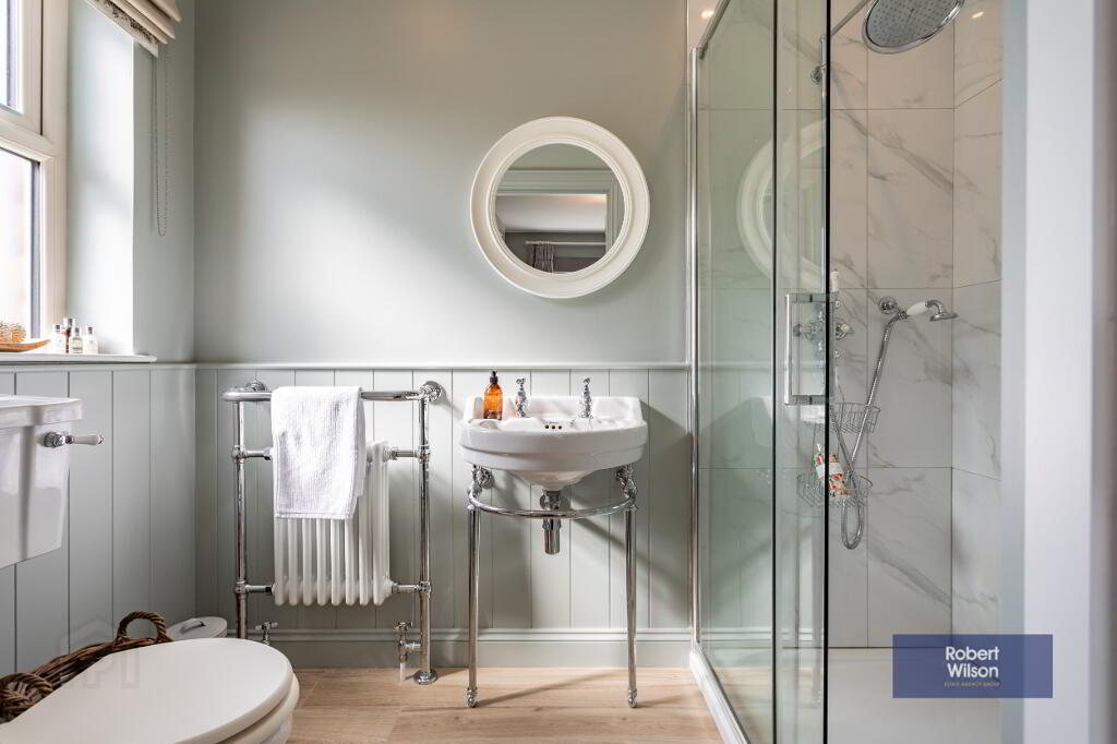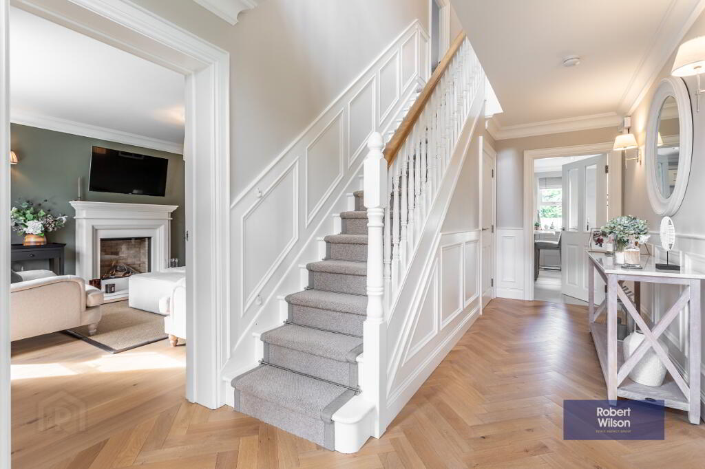 Upstairs, the spacious principal bedroom features a beautifully panelled wall, a separate dressing room, and a luxury en-suite with a large walk-in shower. A second en-suite bedroom, two further bedrooms, and a beautifully appointed family bathroom provide ample accommodation for families of all sizes.