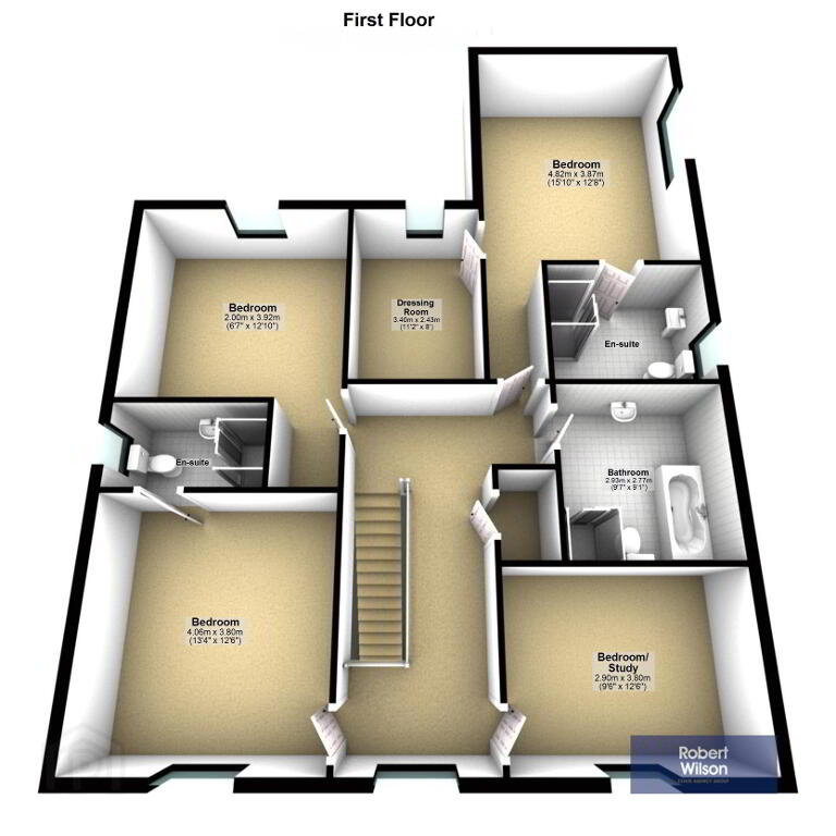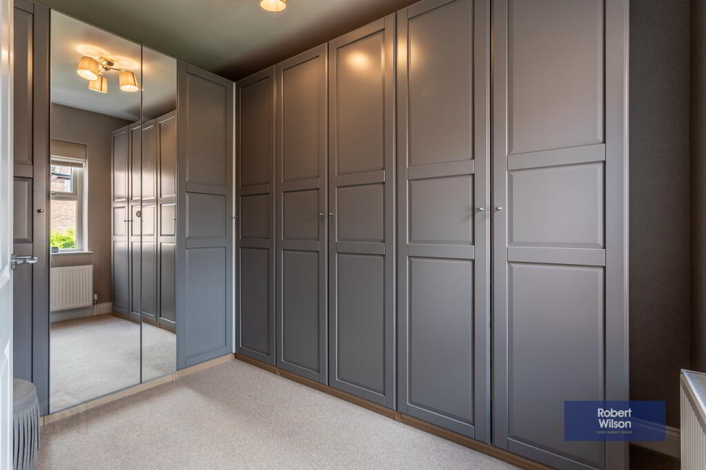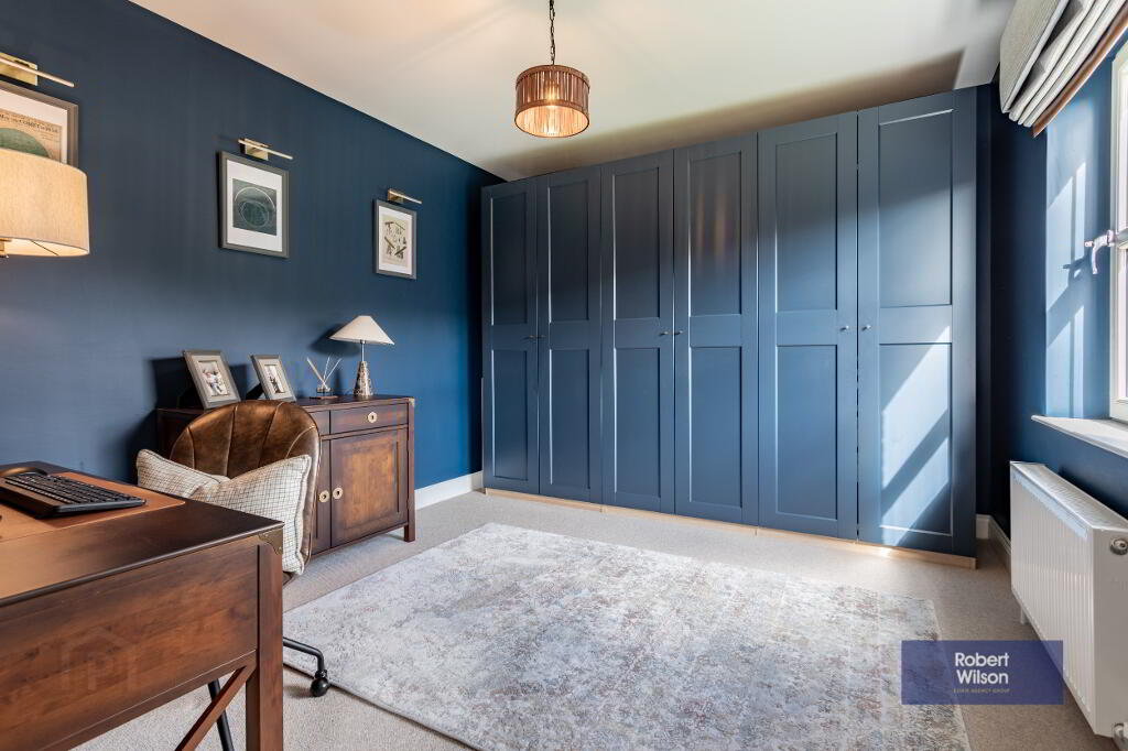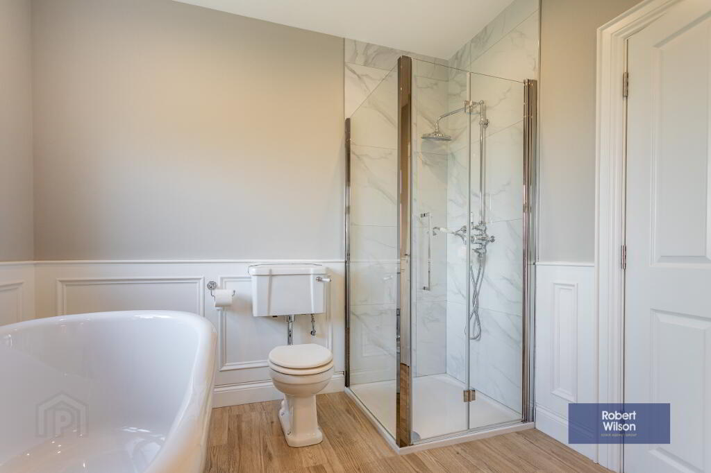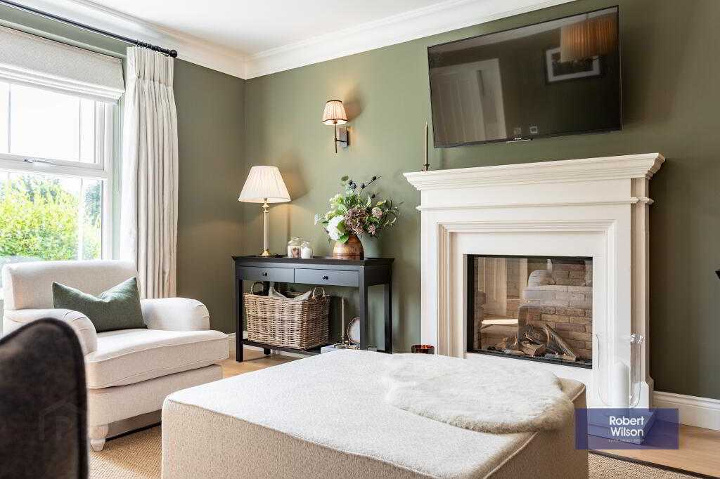 Upstairs, the spacious principal bedroom features a beautifully panelled wall, a separate dressing room, and a luxury en-suite with a large walk-in shower. A second en-suite bedroom, two further bedrooms, and a beautifully appointed family bathroom provide ample accommodation for families of all sizes.