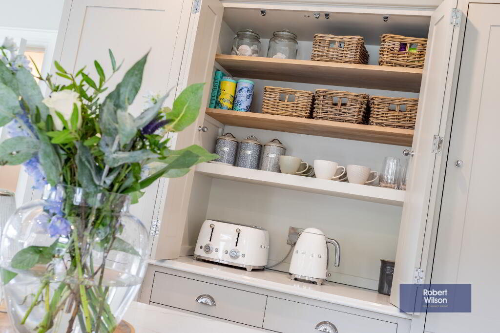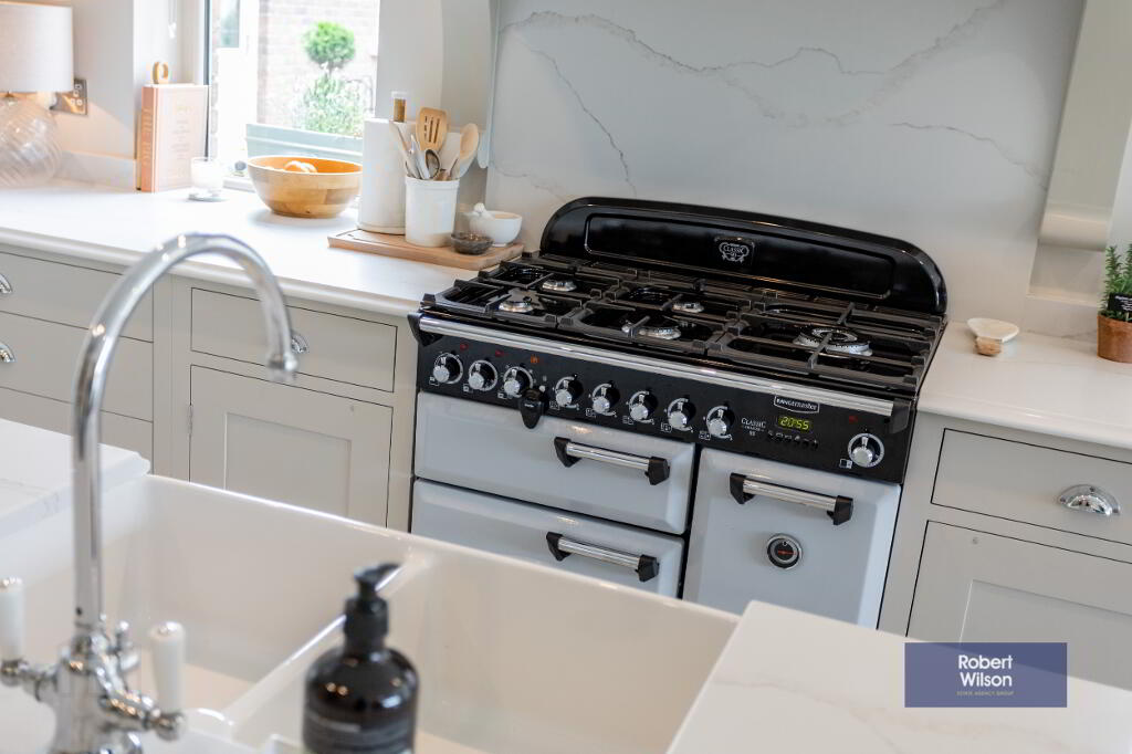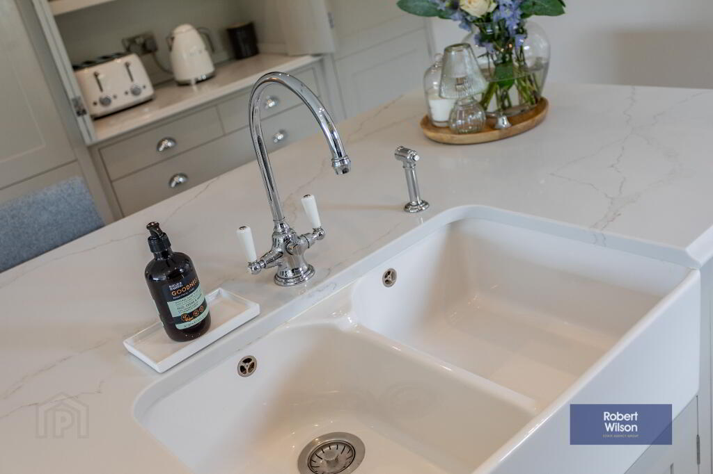 7.98m x 8.07m (26' 2" x 26' 6") Neptune kitchen with excellent range of high and low level units, quartz worktops and upstand, island unit with double Belfast sink unit, storage and seating. Integrated fridge/freezer, integrated dishwasher, space for stove with extractor over.