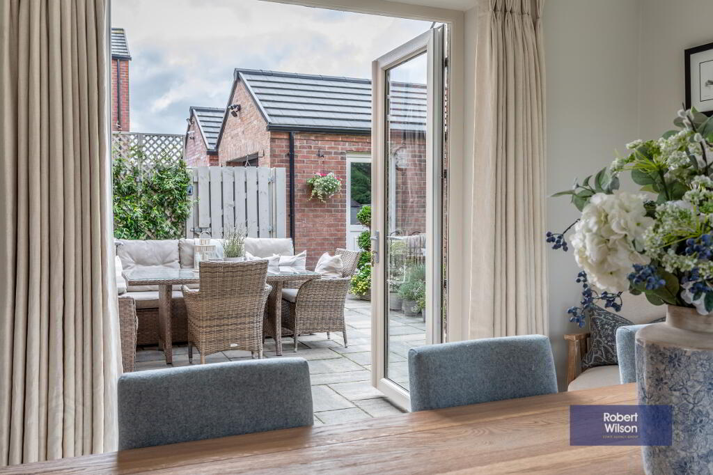 At the heart of the home is a stunning open-plan Neptune kitchen, dining and living space, complete with quartz worktops, island unit, bay window seating with countryside views, and double doors opening to the rear garden. A well-fitted Neptune Utility, cloakroom, and under-stair storage add to the home’s practicality.