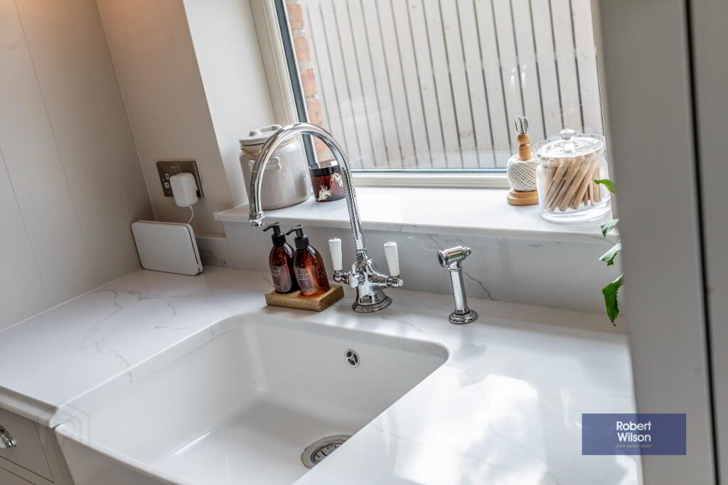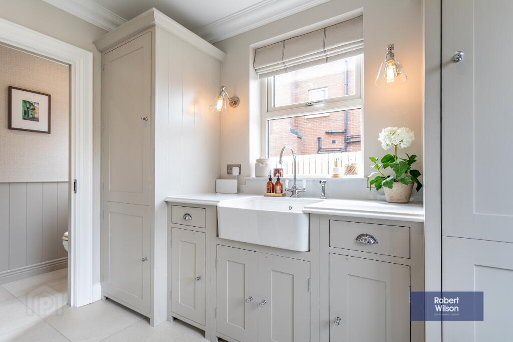 3m x 2.01m (9' 10" x 6' 7") Range of Neptune utility with quartz worktop, upstand and windowsill. Single Belfast sink unit with mixer tap. Plumbed and space for integrated washing machine and tumble dryer. Composite rear door with glazed panel, recessed lighting and extractor fan, tiled floor.