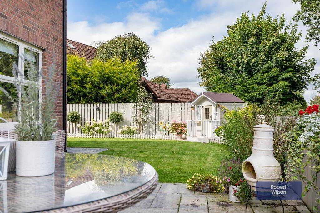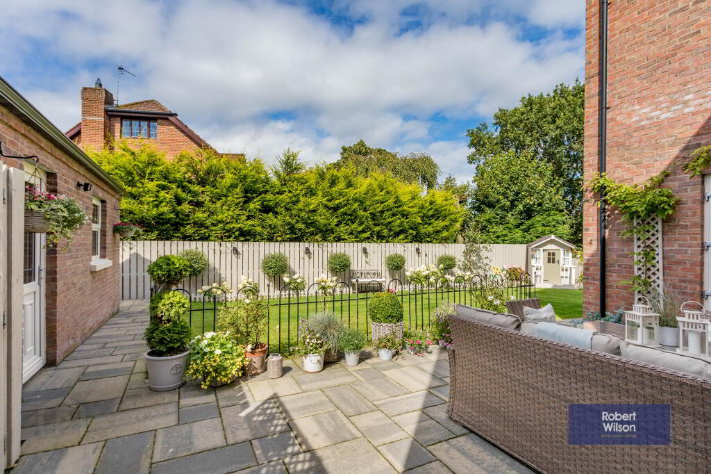 Outside, enjoy a landscaped private rear garden with two patio areas perfect for entertaining, a front lawn bordered by mature hedging, and a detached garage currently used as a gym, fully insulated with power and lighting.