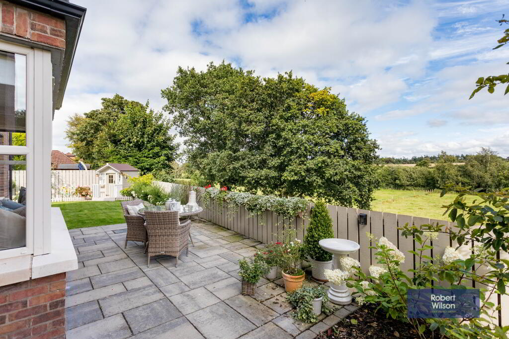 Rear garden in lawn with 2 paved patio areas with countryside views.