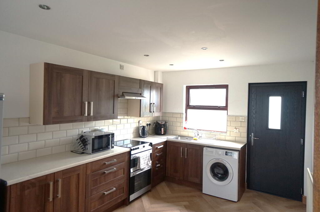 3.02m x 4.93m (9' 11" x 16' 2") Range of high and low level units, laminate worktop, stainless steel sink unit, space for oven and hob, extractor fan, space and plumbed for washing machine, recessed lighting, part tiled walls, composite rear door.