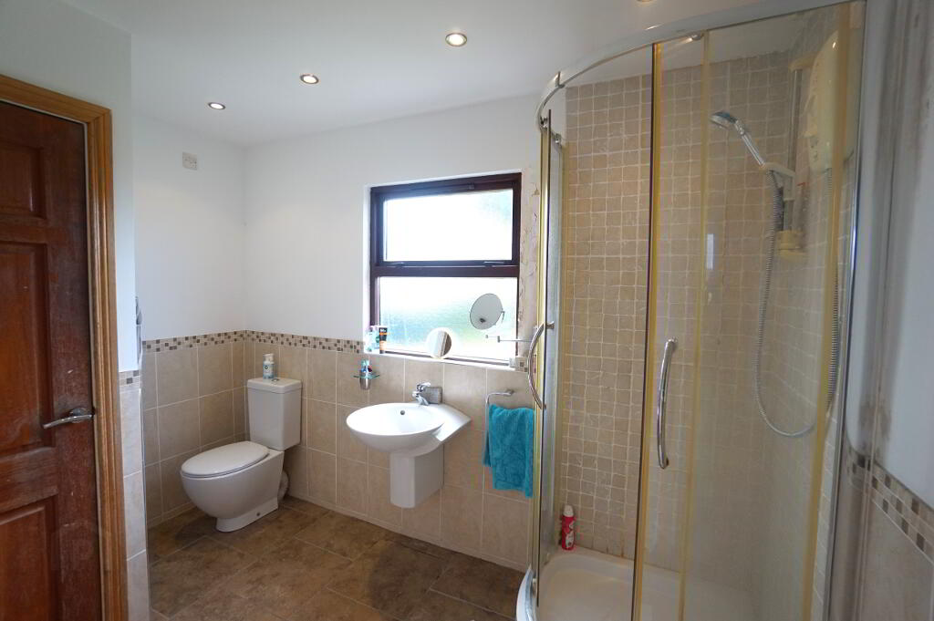 3.11m x 2.06m (10' 2" x 6' 9") White suite comprising; low flush wc, wall hung wash hand basin, walk in shower cubicle with 'Mira' shower, chrome heated towel rail, hotpress housing water cylinder and shelving, part tiled walls and tiled floor.