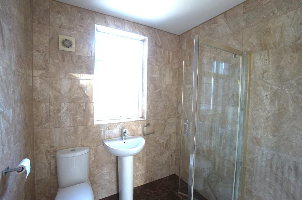 2.05m x 1.93m (6' 9" x 6' 4") White suite comprising; low flush wc, pedestal wash hand basin with mixer tap, walk in shower cubicle with thermostatic valve shower fitting, single panel radiator, extractor fan, fully tiled walls and floor.