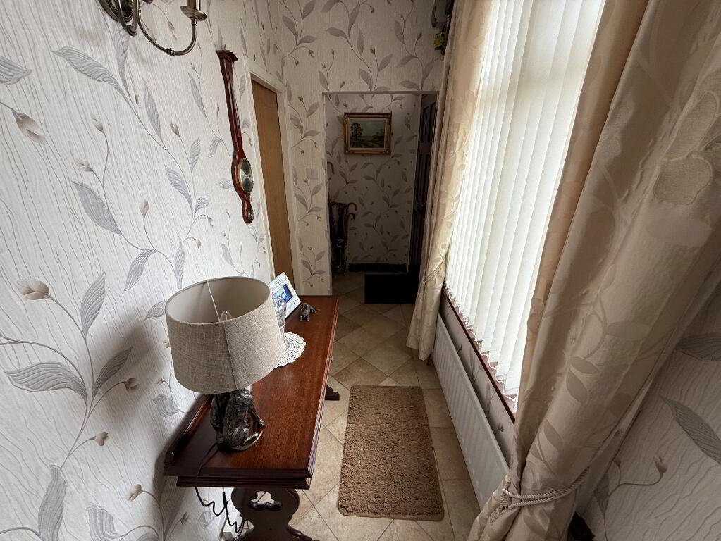 3.77m x 1.16m (12' 4" x 3' 10") Hard wood front door, tiled floor and single panel radiator.