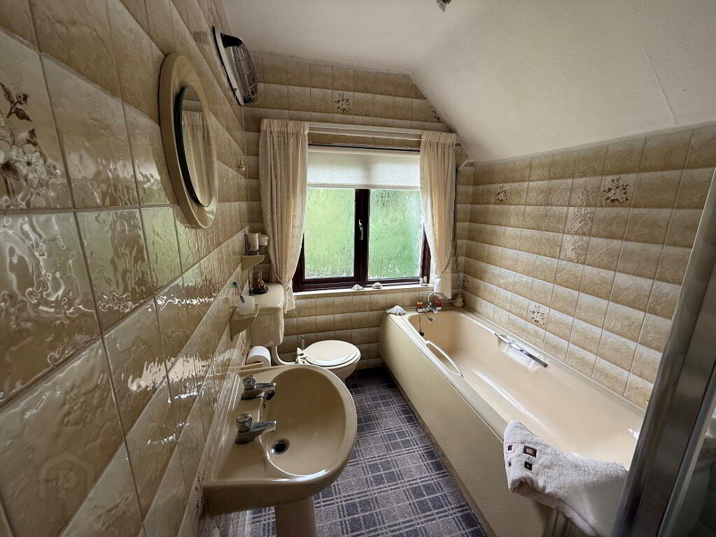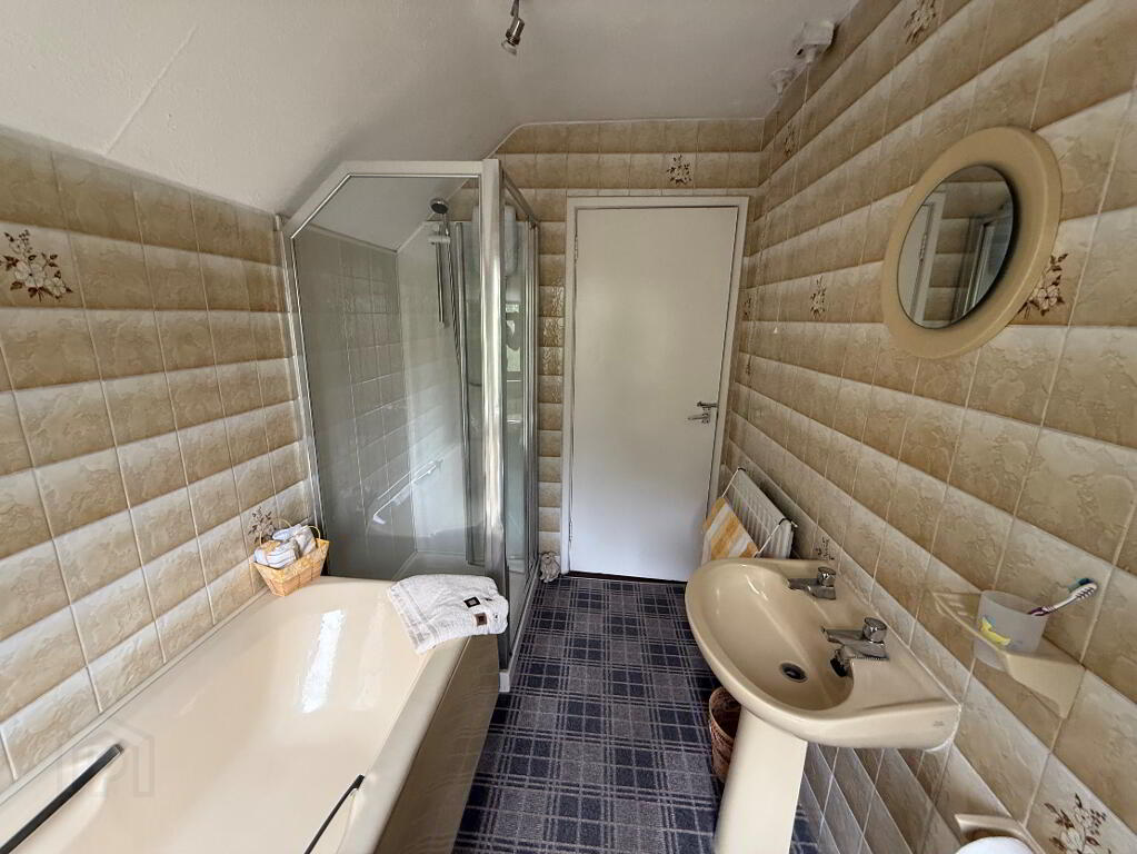 2.85m x 1.78m (9' 4" x 5' 10") Traditional 4 piece bathroom suite comprising, WC, panel bath with shower attachment over, pedestal wash hand basin and walk in shower cubicle and fully tiled walls.
