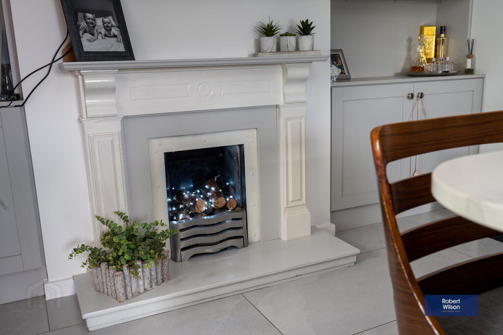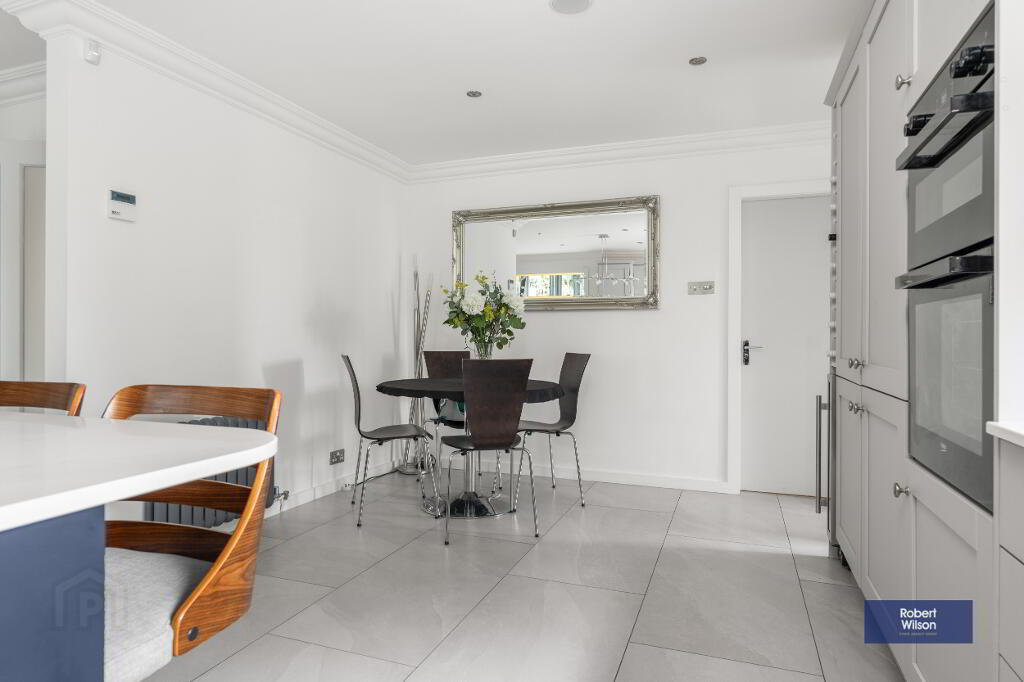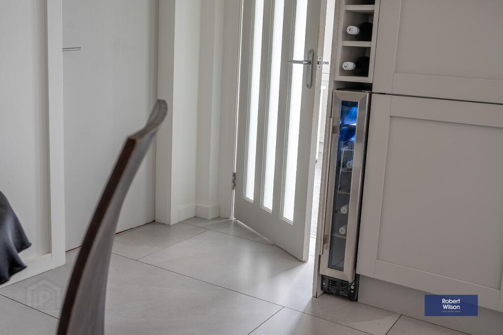 Recently installed bespoke fitted grey shaker style kitchen with quartz work tops. Integrated fridge freezer, wine rack, integrated eye level double oven, 1 1/2 "Bold Blanco" composite sink, 5 ring "Neff" gas hob with fixed canopy extractor fan over. Centre island with ample storage and overhang for entertainment, feature gas fire, feature built in storage and shelving, ceiling cornice, recessed lighting and tiled flooring.