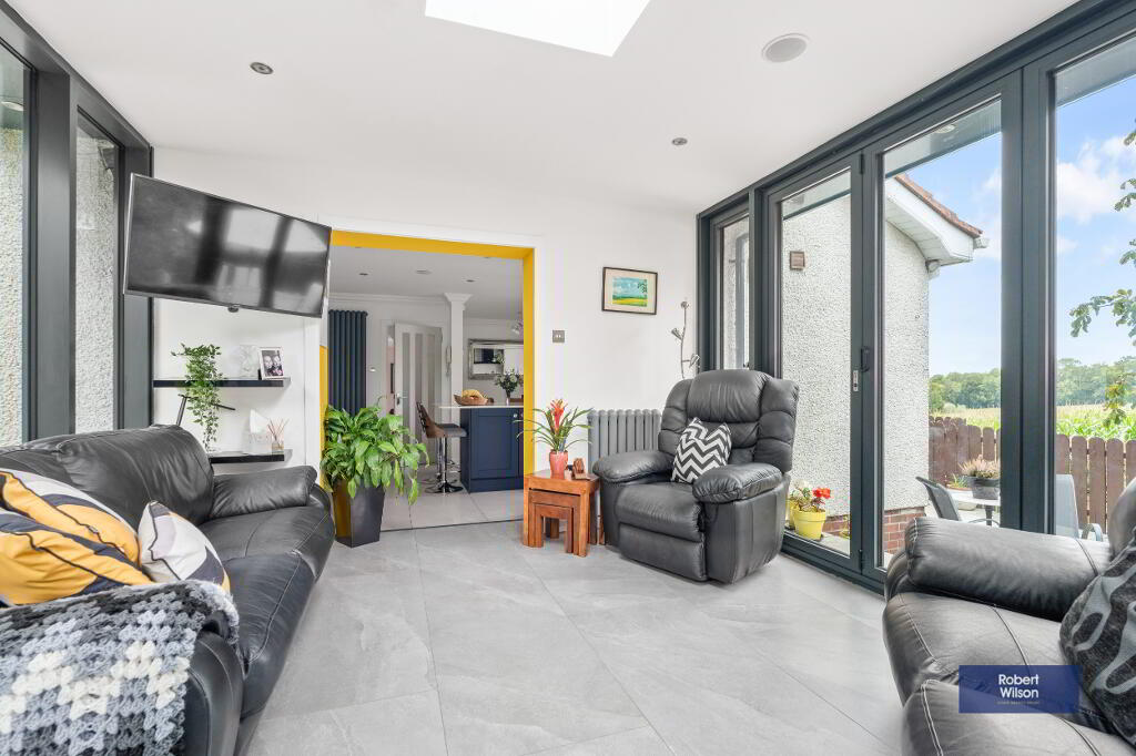 Sliding bi-fold doors to rear, wood burning stove, tiled floor and recessed lights.