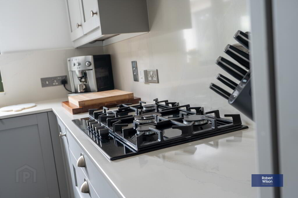 Recently installed bespoke fitted grey shaker style kitchen with quartz