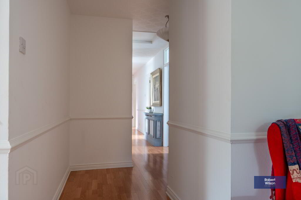Front door with glazed centre piece. Ceiling cornice, centre rose and wood laminate flooring.