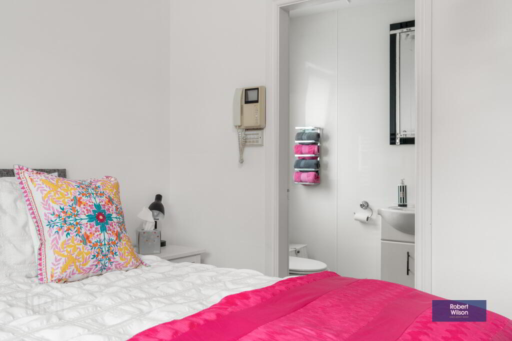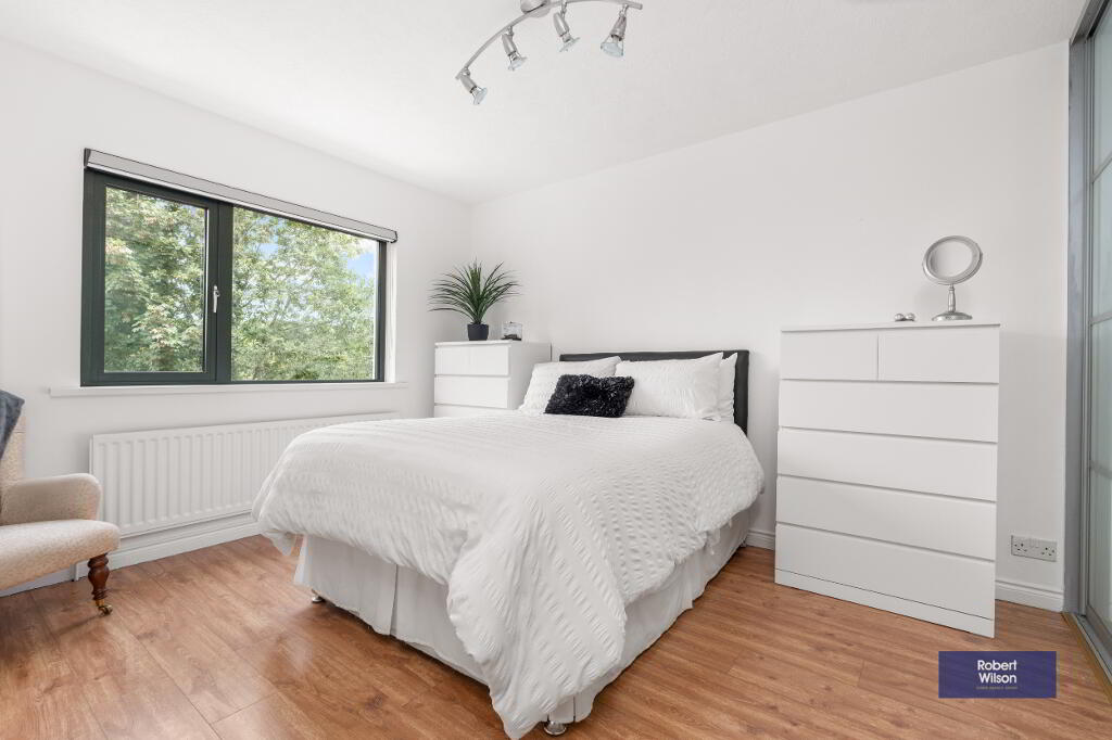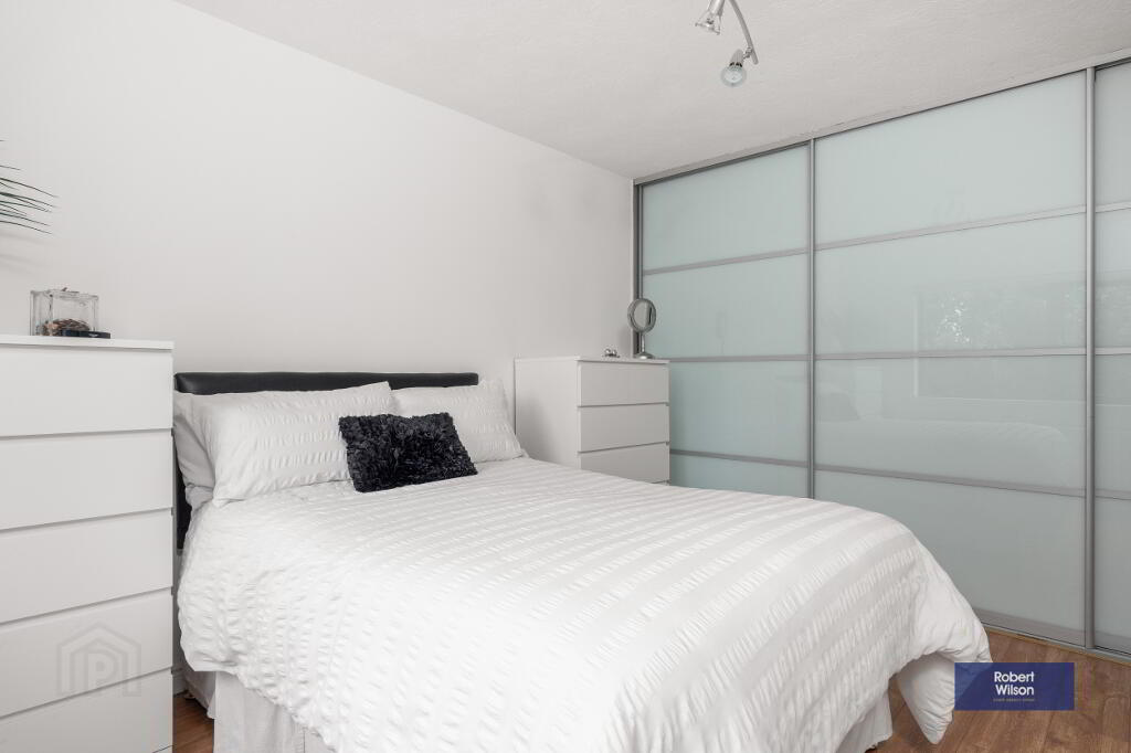 Wood laminate floor, wall to wall slider robe and single panel radiator.