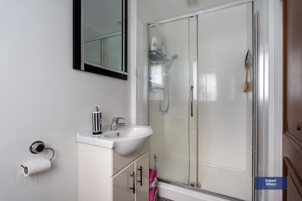 3 piece white suite comprising, wash hand basin incorporated into vanity unit, low flush WC, walk in shower cubicle with Aqualisa power shower, PVC panelled walls, extractor fan and single panel radiator.