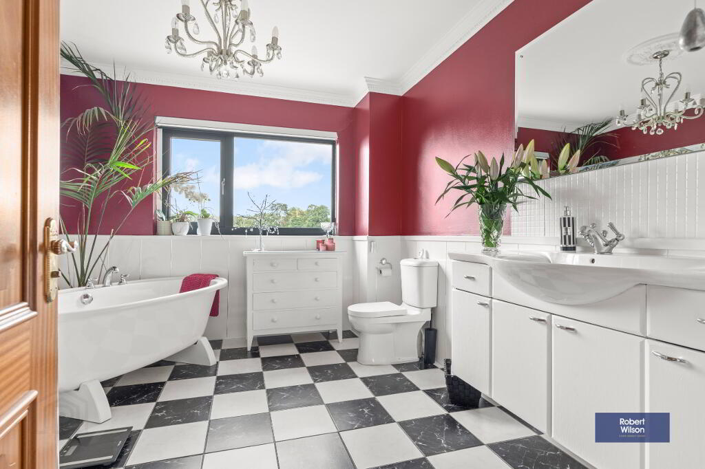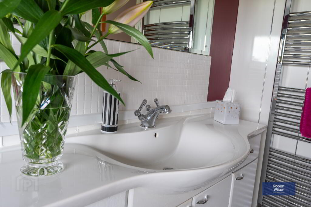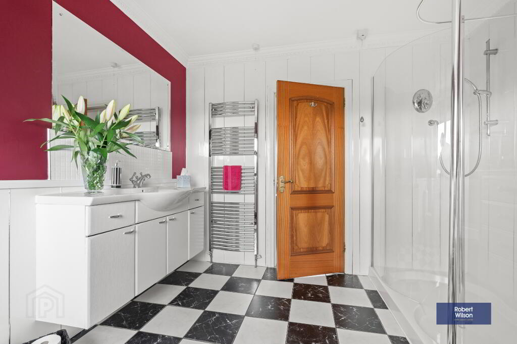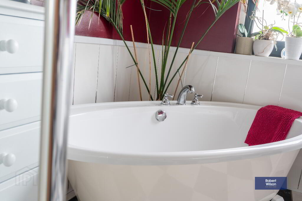 Luxury 4 piece white suite comprising, free standing roll top bath tub, low flush WC, wash hand basin incorporated into mounted vanity unit, large walk in shower cubicle with Triton power shower, wall mounted heated towel rail, tiled flooring, ceiling cornice and ceiling rose.