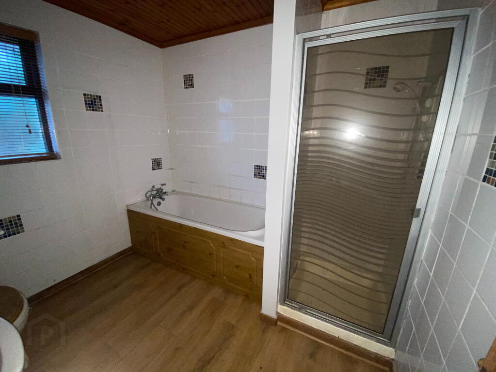 3.16m x 2.36m (10' 4" x 7' 9" furthest points) 4 piece white suite comprising, low flush WC, pedestal wash hand basin, panel bath, walk in shower cubicle, tongue & groove ceiling, recessed lights, fully tiled walls, double panel radiator.