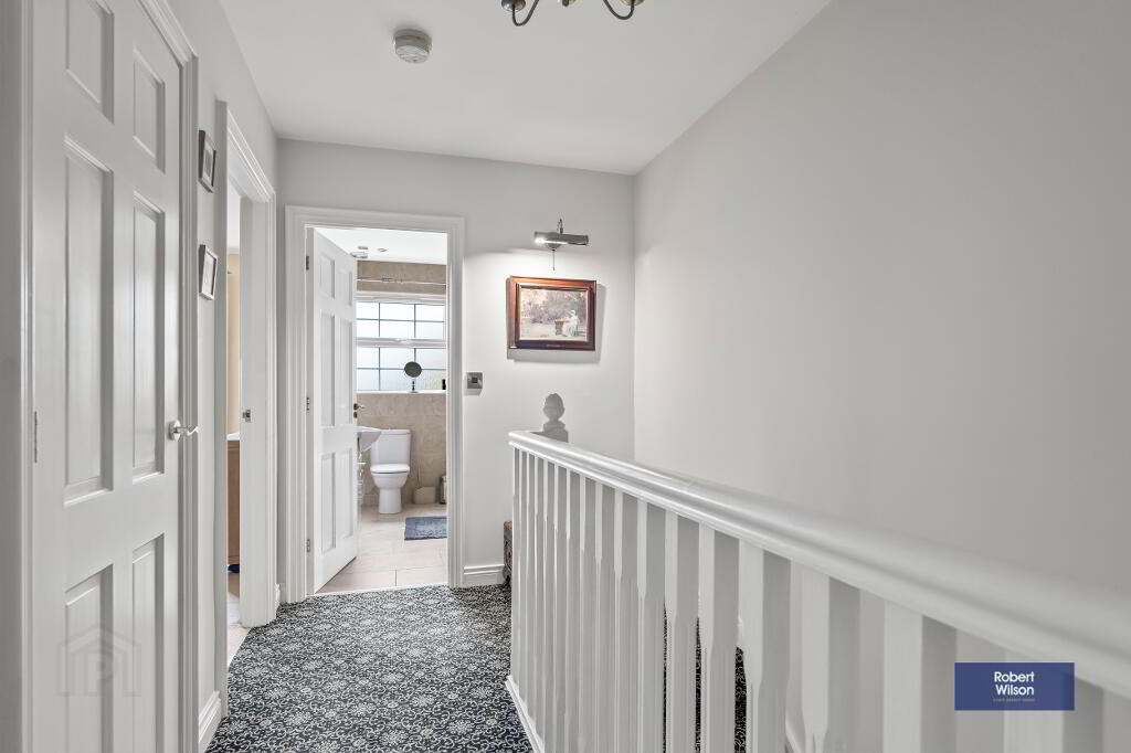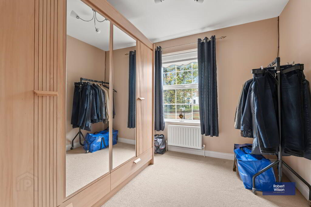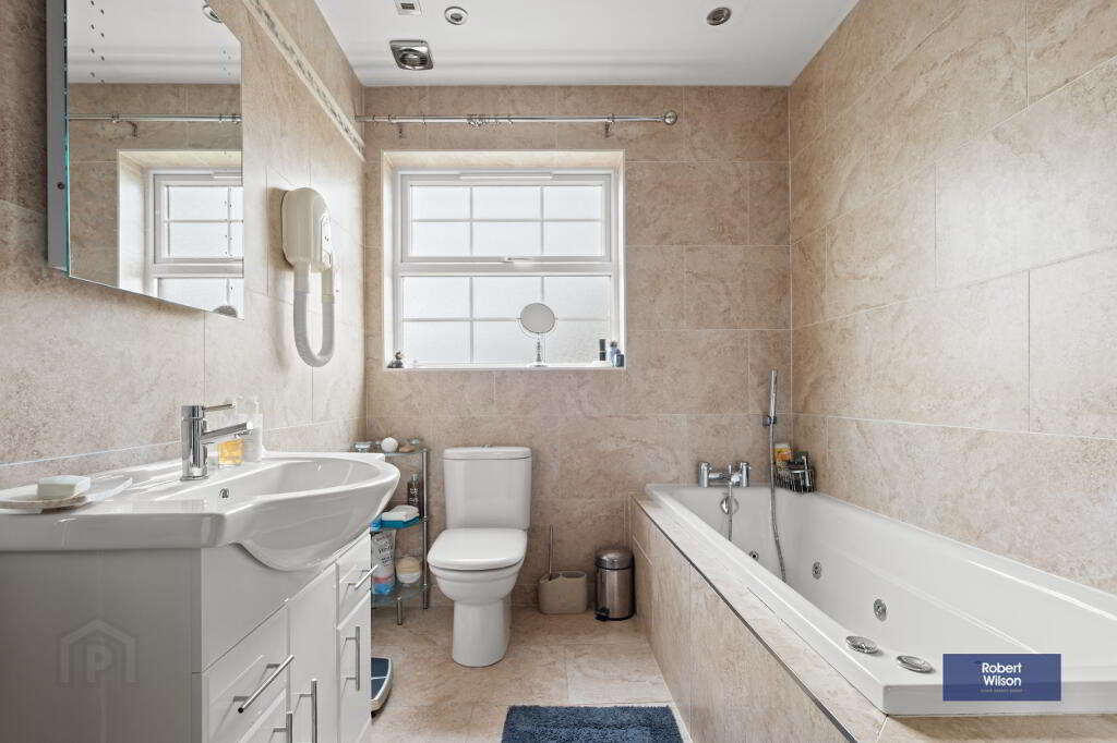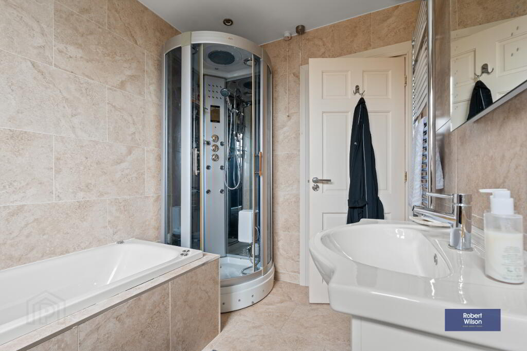 Upstairs, the home offers three comfortable bedrooms, including a generous main bedroom with modern en-suite. The family bathroom is a real highlight, boasting a jacuzzi-style bath and a walk-in ‘Insignia’ shower cubicle for a touch of luxury.