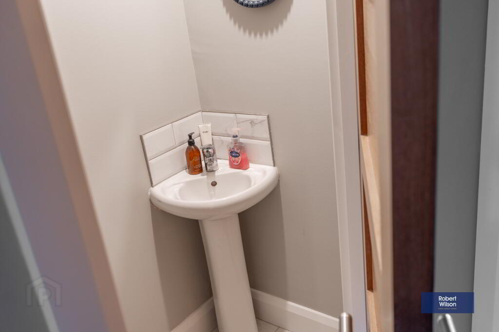 White suite comprising; pedestal wash hand basin, low flush WC, tiled floor, extractor fan, single panel radiator.
