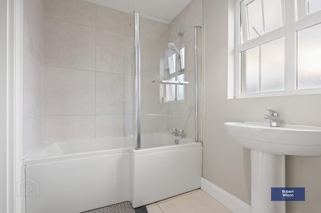 White suite comprising; low flush wc, pedestal wash hand basin, bath with electric shower over, part tiled walls, tiled floor and extractor fan.