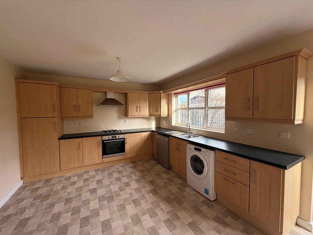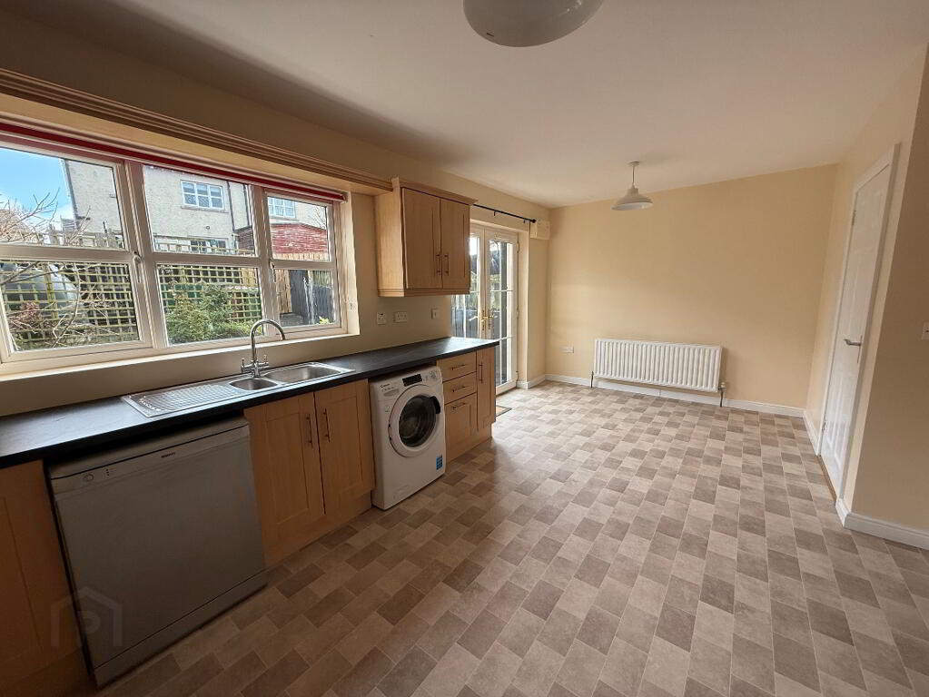 5.91m x 3.68m (19' 5" x 12' 1") Range of high and low level units, laminate work tops, single oven, integrated 4 ring gas hob with stainless steel extractor fan, 1 1/2 stainless steel sink with mixer tap, space for fridge freezer, washing machine and dishwasher, double panel radiator, uPVC French doors to rear.