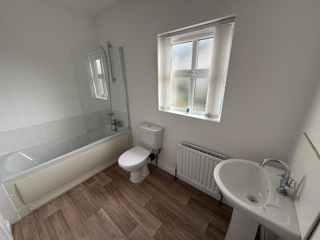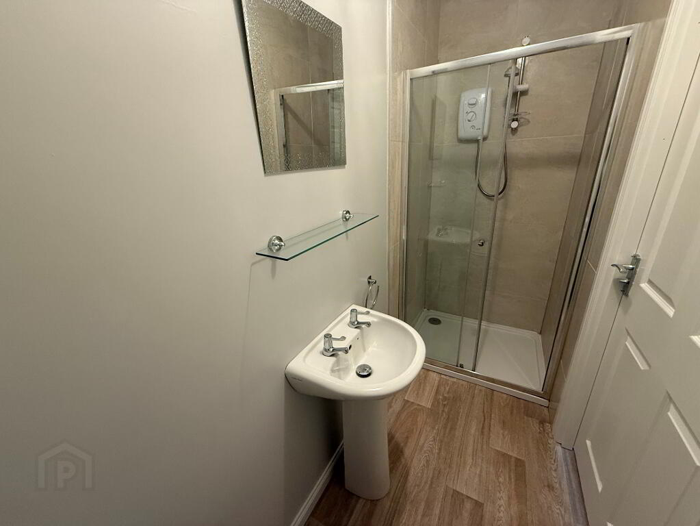 3 piece white suite comprising, pedestal wash hand basin, low flush WC, walk in shower cubicle with thermostat control unit, part tiled walls, single panel radiator, extractor fan.