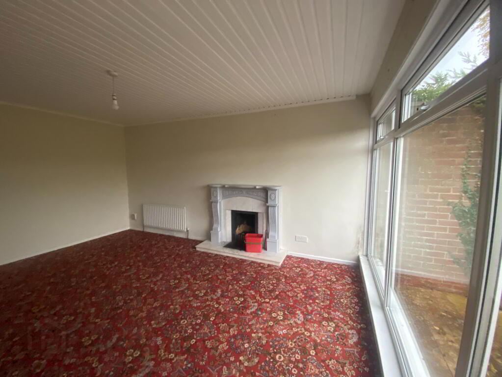 4.99m x 3.69m (16' 4" x 12' 1") Glazed panel door & side window to living room with open fire set in a tiled hearth with a tiled back & wooden surround & mantle, tongue & groove ceiling, double panel & single panel radiators, picture window overlooking the garden and green space beyond.