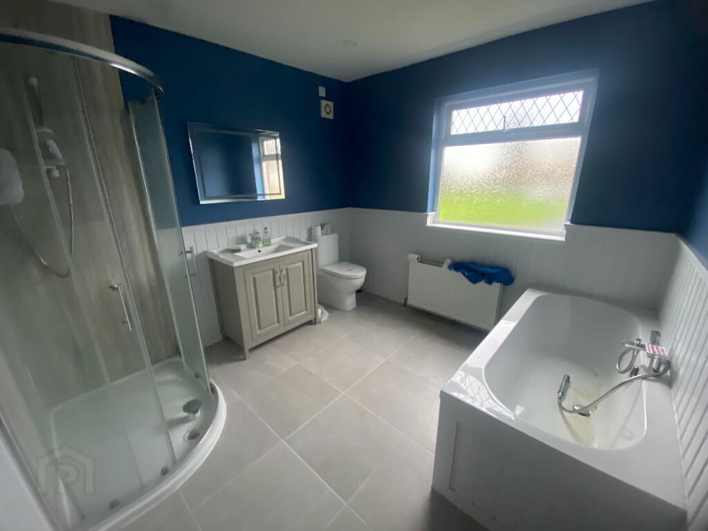 2.87m x 3.00m (9' 5" x 9' 10") 4 piece white suite comprising, low flush WC, panel bath, vanity unit incorporating wash hand basin, corner walk in shower cubicle with PVC panelling, 1/2 wood panelled walls, recessed lights, extractor fan.