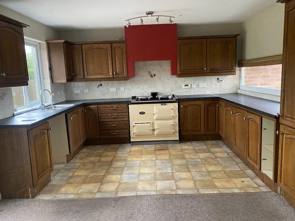 5.61m x 3.81m (18' 5" x 12' 6") Solid wooden kitchen with facilities for a Range style cooker, space for washing machine, 1.5 stainless steel sink & mixer tap, half vinyl, half carpet flooring, double patio doors to rear.