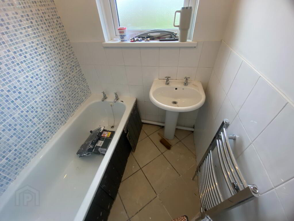 1.56m x 1.67m (5' 1" x 5' 6") 2 piece white suite comprising, pedestal wash hand basin, panel bath with shower over, part tiled walls, tiled floor, chrome heated towel rail, extractor fan.