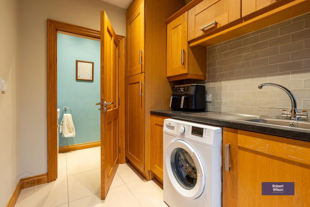 The heart of the home is the impressive kitchen, fitted with a high-quality solid oak kitchen, granite worktops, island unit and a full range of integrated appliances—ideal for both everyday family life and entertaining. A separate utility room and ground floor WC add further practicality. Underfloor heating throughout the ground floor enhances comfort and efficiency.