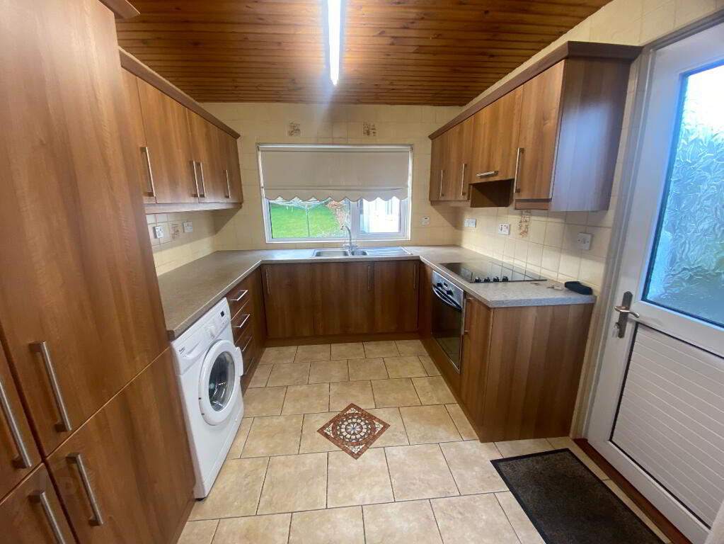 The front garden is laid in lawn, while the rear garden offers a paved patio area, a raised lawn, boundary fencing, and mature trees, providing a pleasant and private outdoor space. The property further benefits from oil-fired central heating and uPVC double glazing throughout.