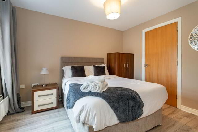 The property offers two double bedrooms, including a master bedroom with en-suite, along with a modern open-plan kitchen, living, and dining area.