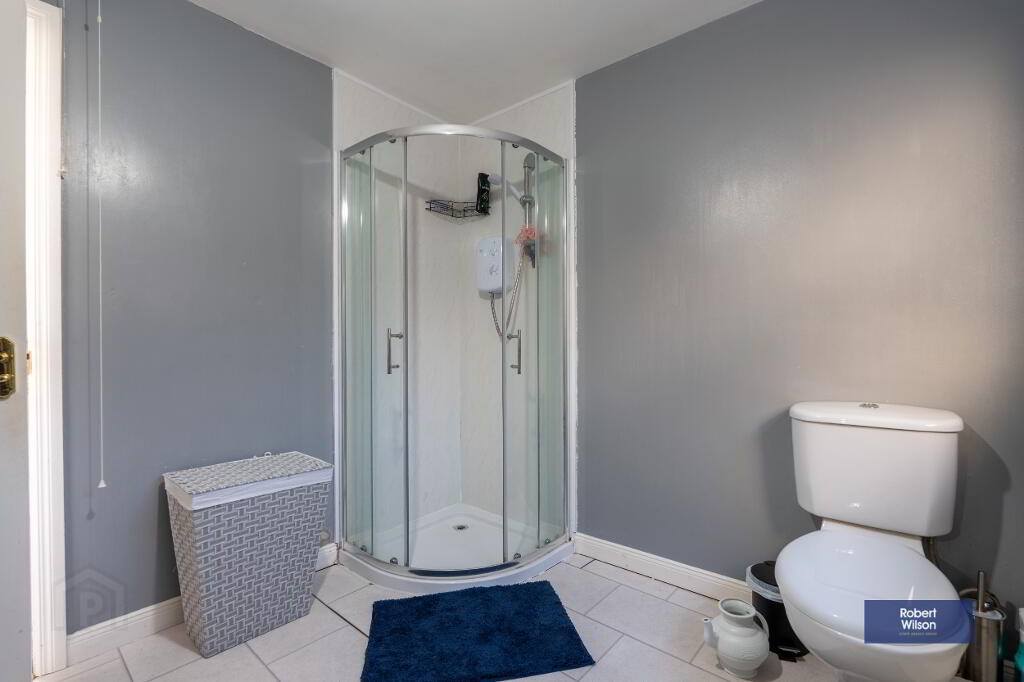 White suite comprising; low flush w.c., pedestal wash hand basin, walk in shower cubicle with electric shower, single panel radiator, extractor fan, tiled floor, part tiled walls.