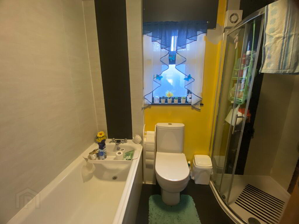 2.19m x 1.69m (7' 2" x 5' 7") 4 piece white suite comprising, low flush WC, pedestal wash hand basin, panel bath, walk in shower cubicle, PVC ceiling & part walls, double panel radiator, slate effect laminate flooring.