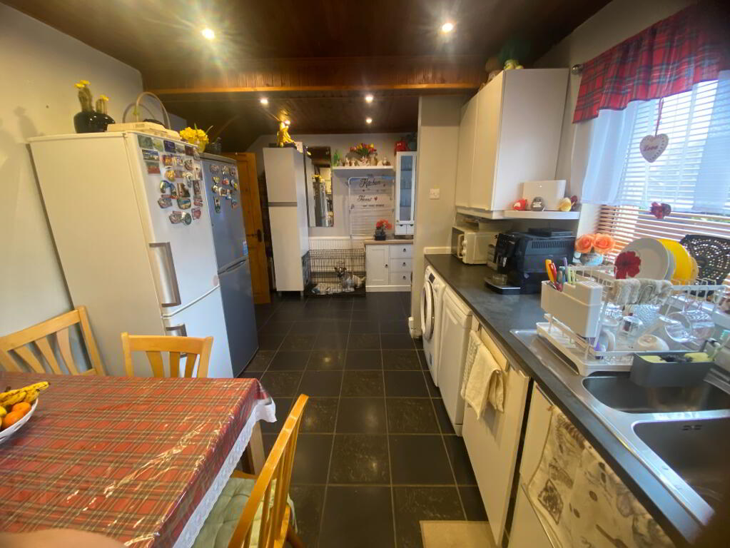5.85m x 2.41m (19' 2" x 7' 11") Range of high & low level white units, integrated hob & oven with extractor fan over, space for washing machine, dishwasher & fridge freezer, 1.5 stainless steel sink unit, mixer tap, tongue & groove ceiling, recessed lights, 1/2 glazed door to rear.