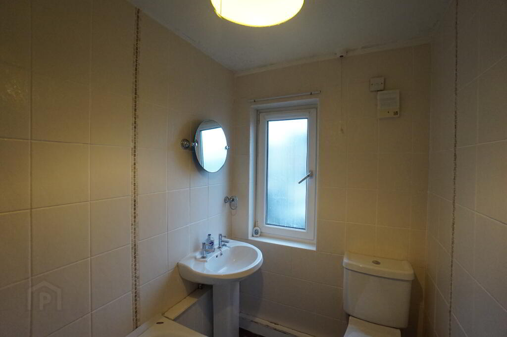 White suite comprising; low flush w.c., pedestal wash hand basin, panel bathtub with thermostatic shower over, chrome heated towel rail, fully tiled walls, tiled floor, extractor fan.