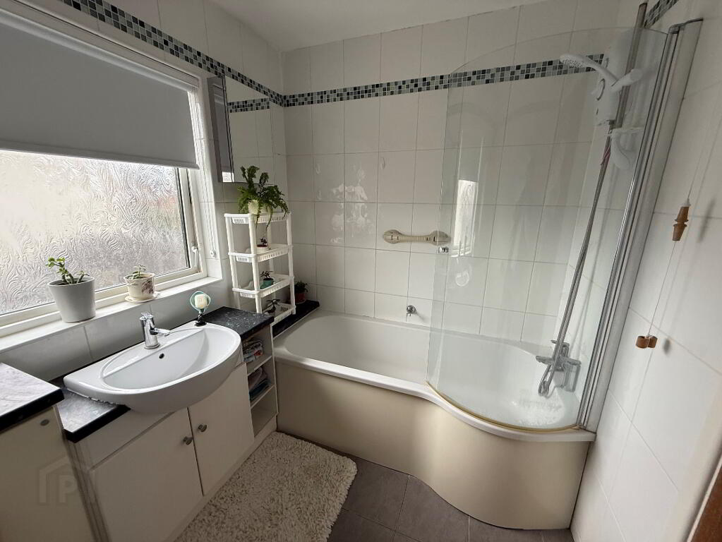 7.9m x 6.4m (25' 11" x 21' 0") White suite comprising low flush w.c., wash hand basin in vanity unit and storage, panelled bath with 'Triton' electric shower over, tiled walls and floor, single panel radiator.