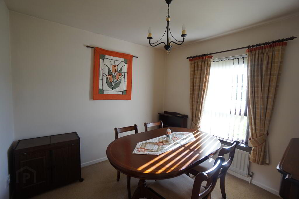 The entrance hall features a uPVC front door with glazed panel and sidelight, along with access to the roof space, hot press and cloakroom storage. The lounge is bright and inviting, centred around a feature fireplace with mahogany surround, tiled inset and hearth, creating a warm focal point to the room.