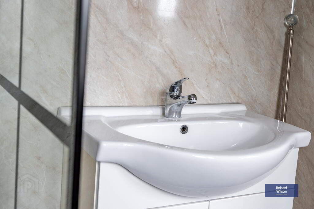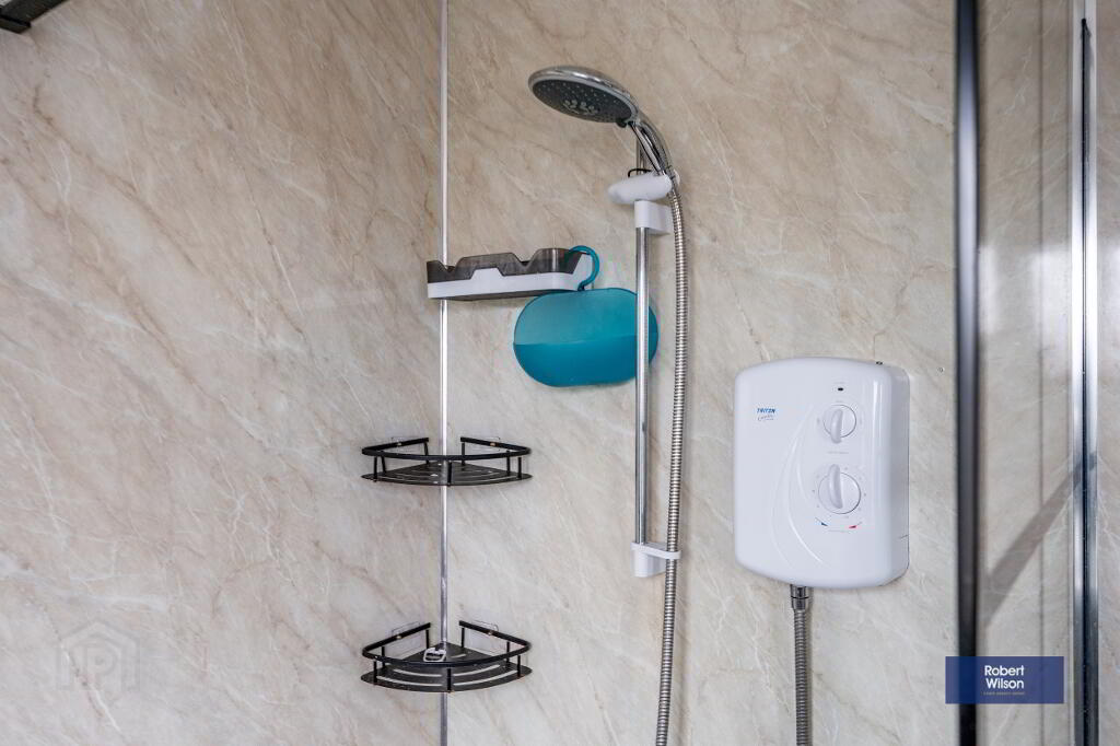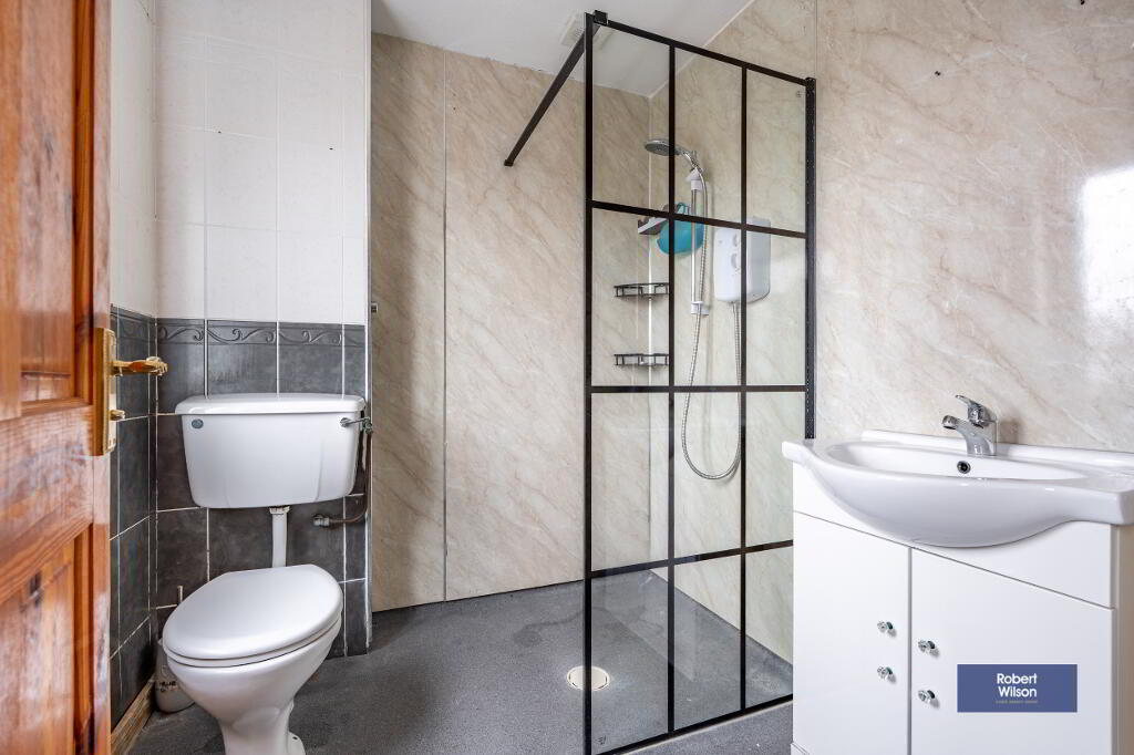 1.93m x 2.05m (6' 4" x 6' 9") Three piece white suite comprising, WC, wash hand basin incorporated in vanity unit, walk in shower cubicle with "Triton Enrich" shower unit. Part PVC walls, extractor fan, single panel radiator.