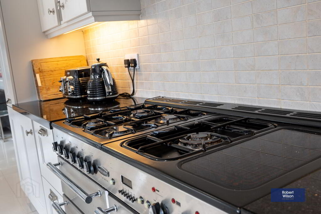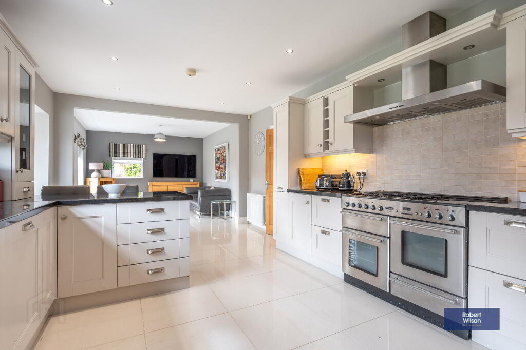 Excellent range of high and low level solid wood units with quartz worktops with undermount stainless steel sink and mixer tap, integrated dishwasher, 'space for American style fridge freezer, space for range, large extractor over, tiled floor, recessed lighting, 2x double panelled radiators.