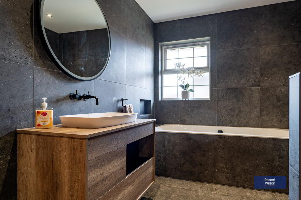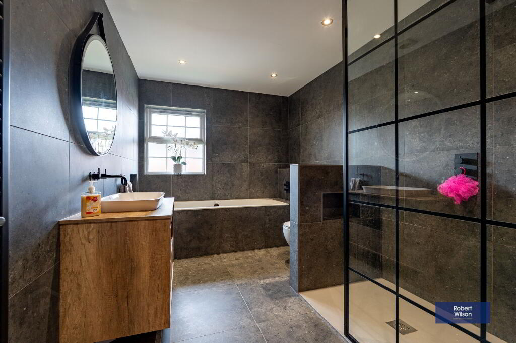 3.90m x 2.39m (12' 10" x 7' 10") 'Geberit' white suite comprising; vanity incorporated wash hand basin with 'Crosswater' mixer tap, bathtub , wall hung w.c, large walk-in shower cubicle with rainfall head and handheld, heated towel rail, fully tiled walls, tiled floor, recessed lighting, extractor fan.