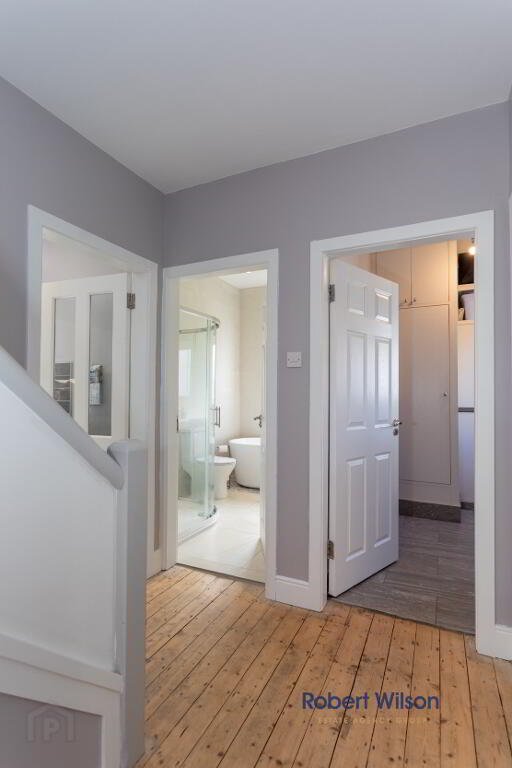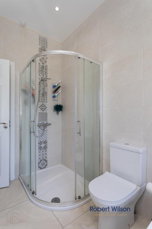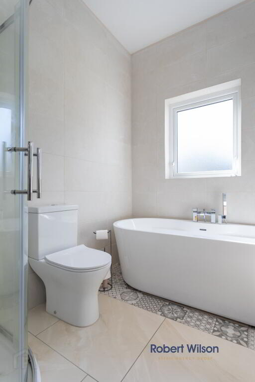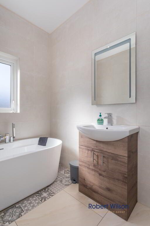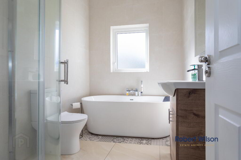 White suite comprising; wash hand basin with vanity incorporated, free standing bath tub with mixer tap and telephone fitting, low flush W.C., large walk in shower cubicle, grey heated towel rail, tiled flooring, extractor fan, recessed lighting, fully tiled walls.
