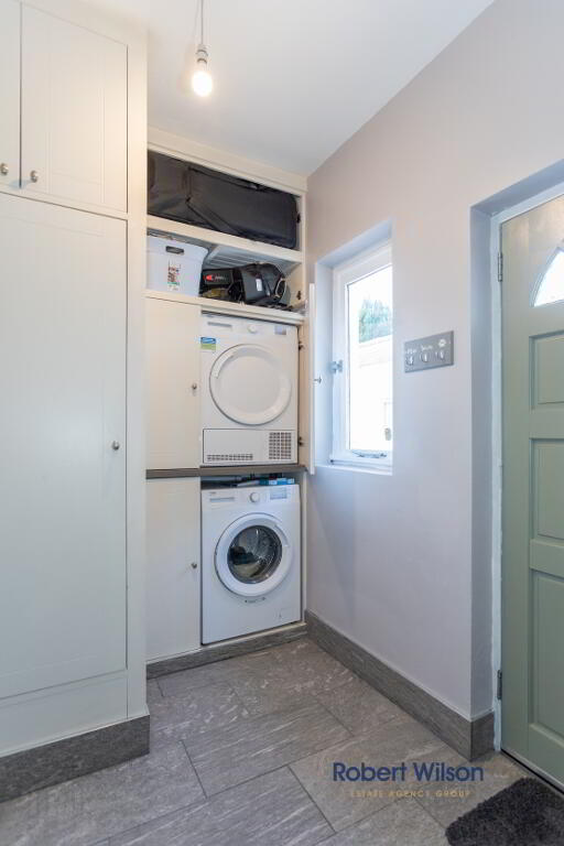 Range of built in units, housing pressurised water system, space for washing machine and tumble dryer in stacker units. Access to roof space via 'Slingsby' ladder, floored and light. Tiled floor, solid wooden door to rear patio.