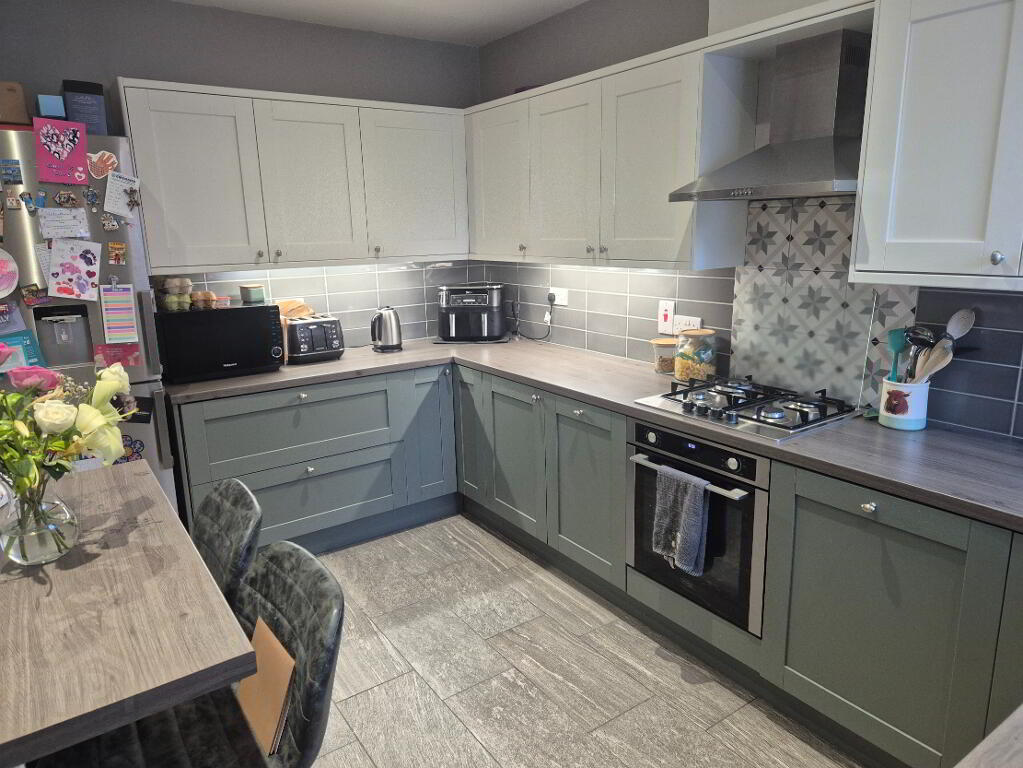 Fitted kitchen with range of high and low level units, laminate worktops, built in oven, 4 ring gas hob, extractor hood, tiled splash back, space for fridge freezer, tiled floor and skirting, recessed lighting, stainless steel sink unit with mixer tap, under counter lighting.