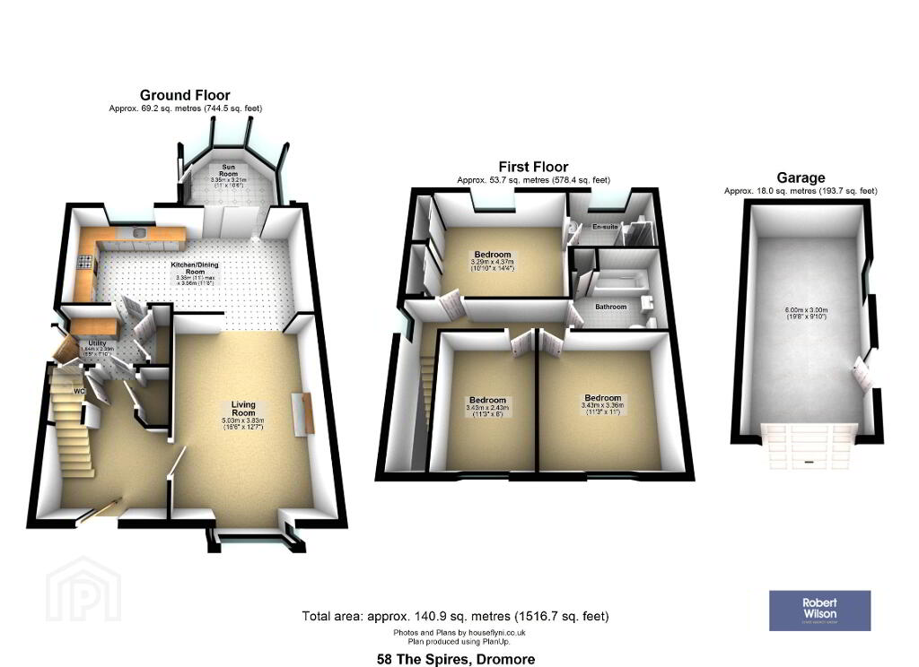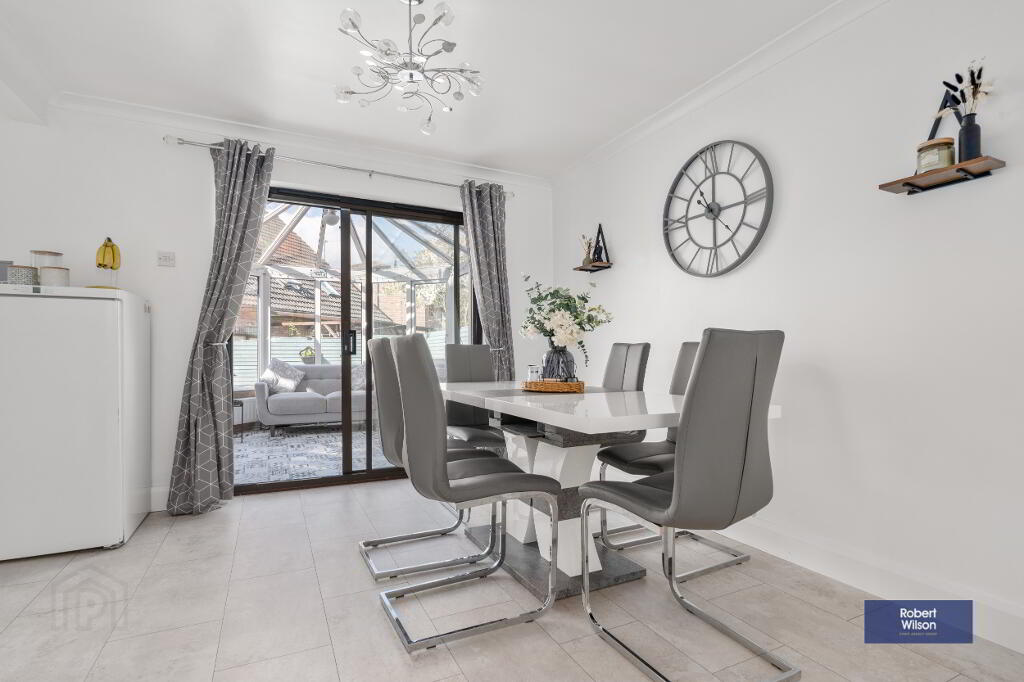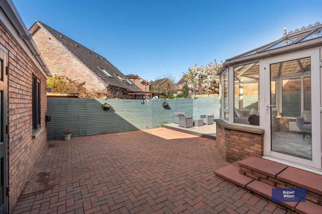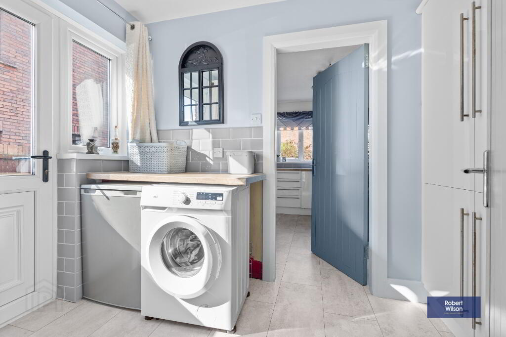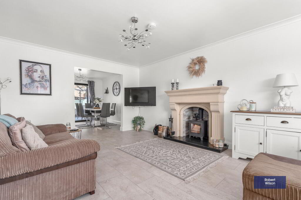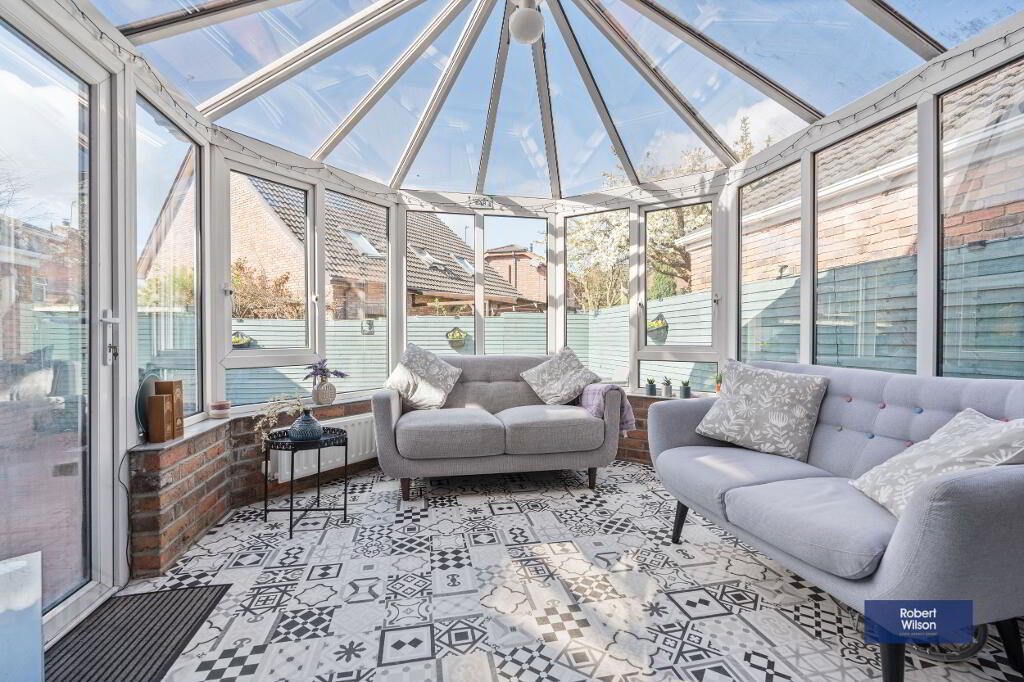 The ground floor welcomes you with a bright entrance hall leading to a generous lounge, complete with a feature bay window and an attractive marble fireplace with multi-fuel stove. This space flows seamlessly into the open-plan kitchen and dining area, fitted with a range of units and integrated appliances, creating the perfect setting for both everyday living and entertaining. Patio doors open into a charming conservatory with feature redbrick detailing, providing additional living space with direct access to the rear garden. A practical utility area with W.C completes the ground floor.