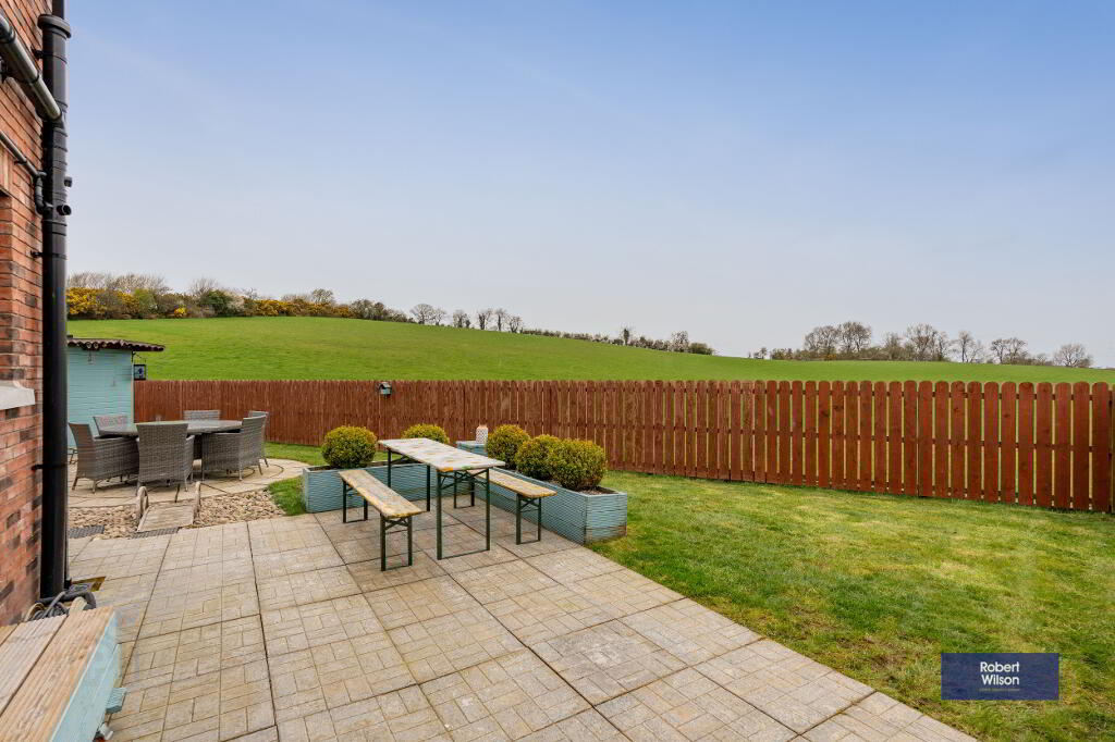 Spacious private site with beautiful views over the open countryside. completely enclosed. Paved patio with additional circular patio feature. Outside tap, oil tank. Side gate to front and access to garage.