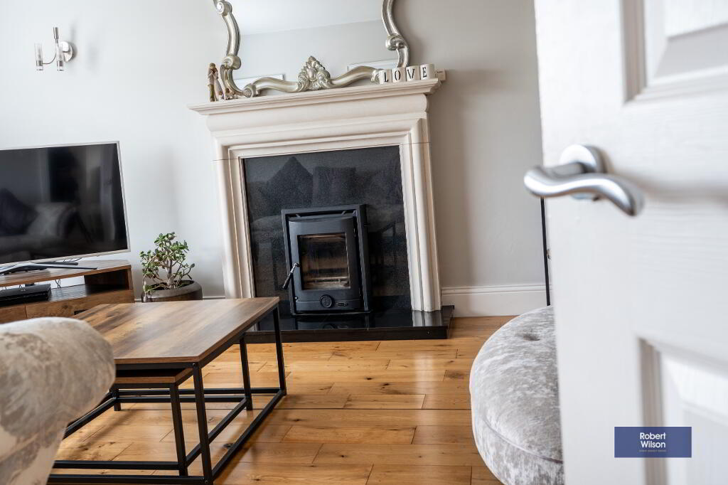 The property welcomes you with a bright entrance hall featuring wooden flooring and useful storage. The lounge is both cosy and stylish, centred around a striking stone fireplace with granite inset and multi-fuel stove-perfect for relaxing evenings.