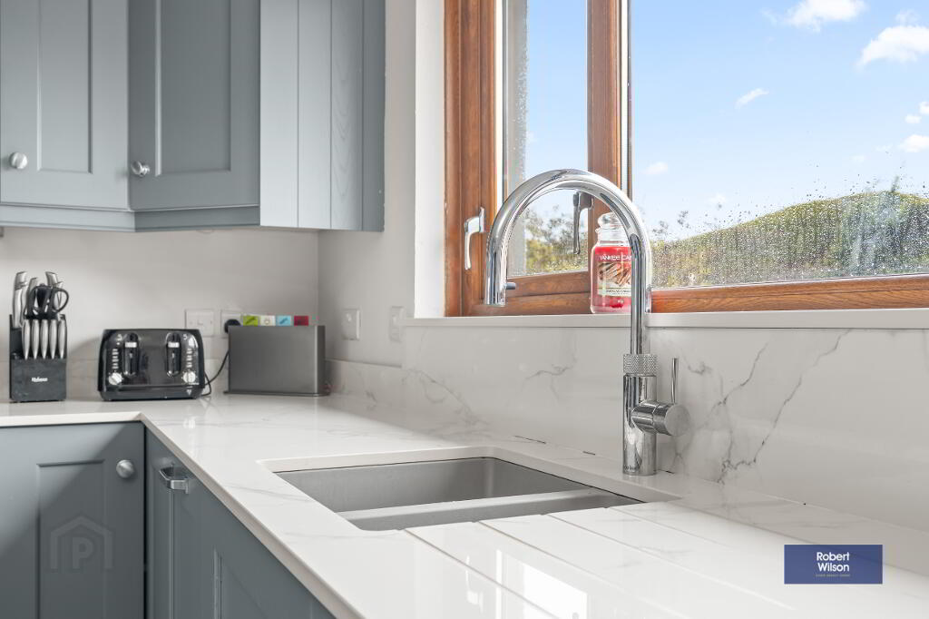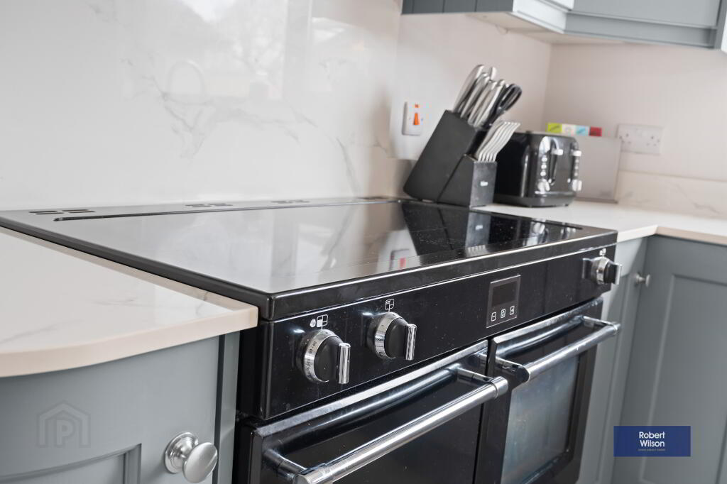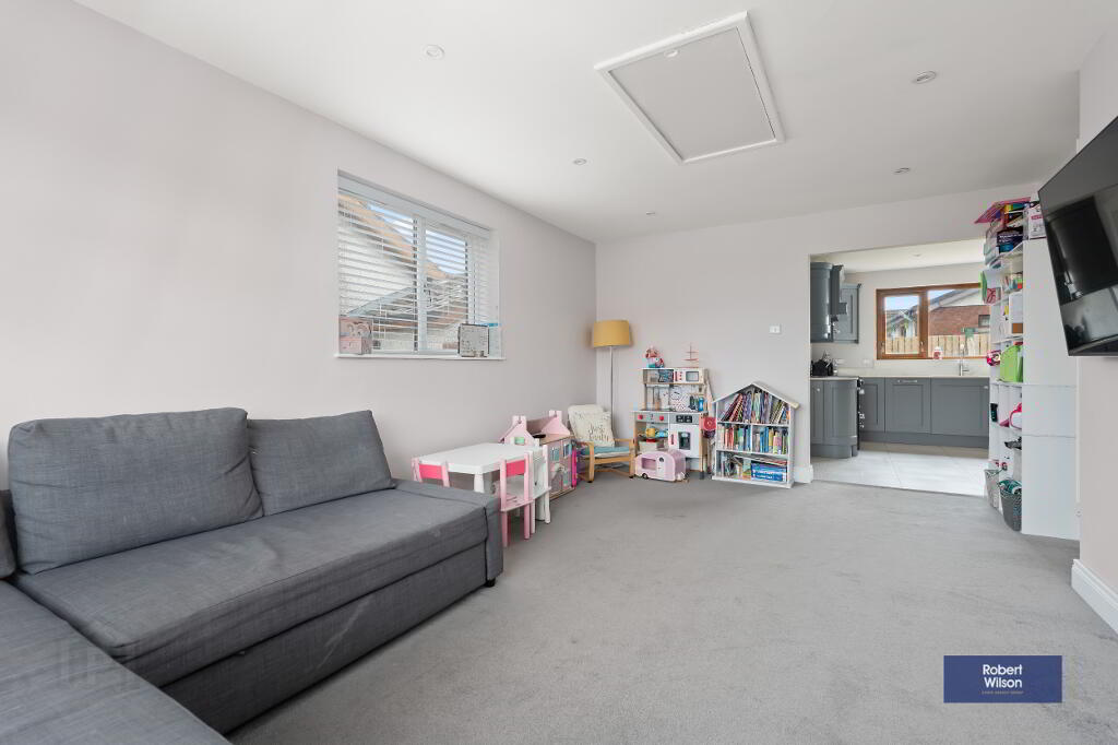 At the heart of the home is an impressive open-plan kitchen, dining, and living space. The kitchen boasts an excellent range of high and low-level units, sleek Dekton worktops, and quality integrated appliances, including a Quooker tap and dishwasher. There is ample room for a range oven and American-style fridge freezer, making it a perfect space for both everyday living and entertaining. The adjoining living area enhances the sense of space and provides access to a floored attic via ladder.