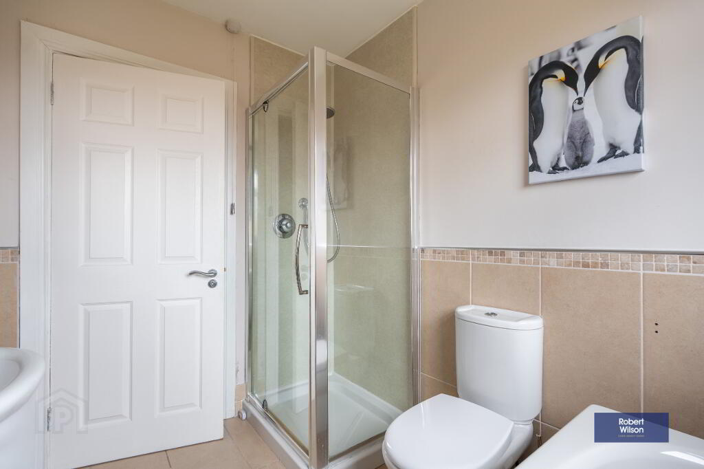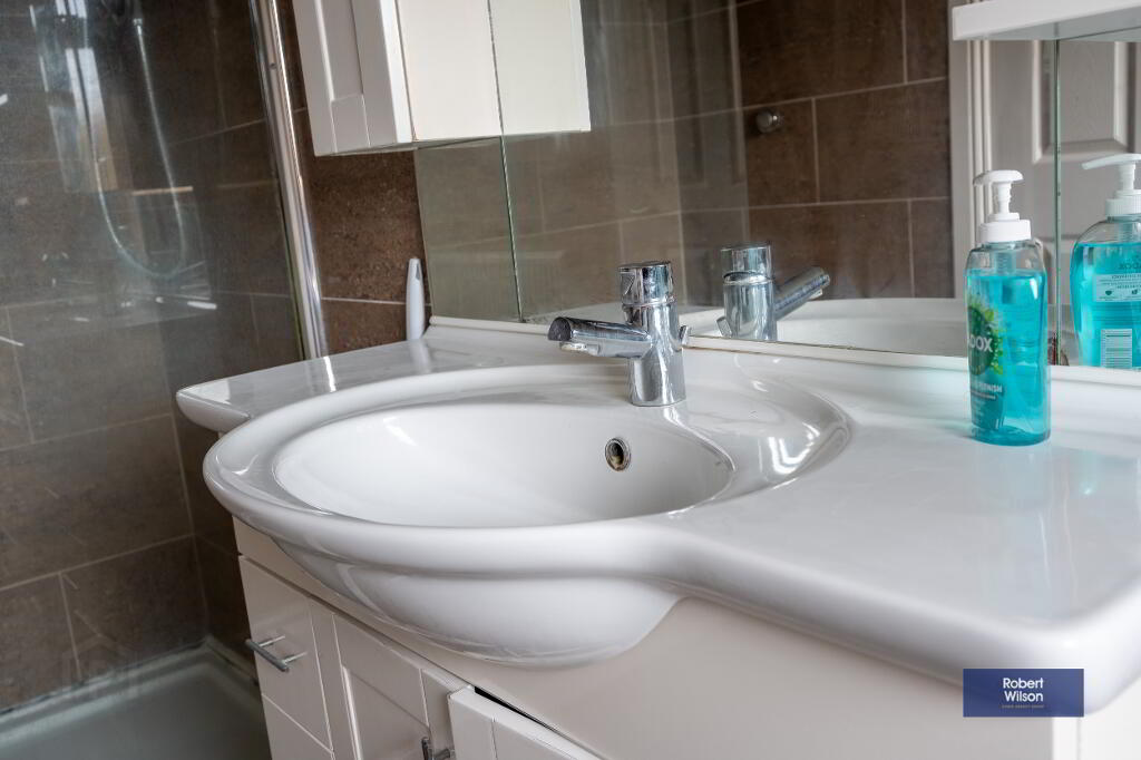 White suite comprising; Vanity incorporated wash hand basin, low flush w.c., large walk in shower with Aqualisa shower, recessed lighting, fully tiled walls, tiled floor.